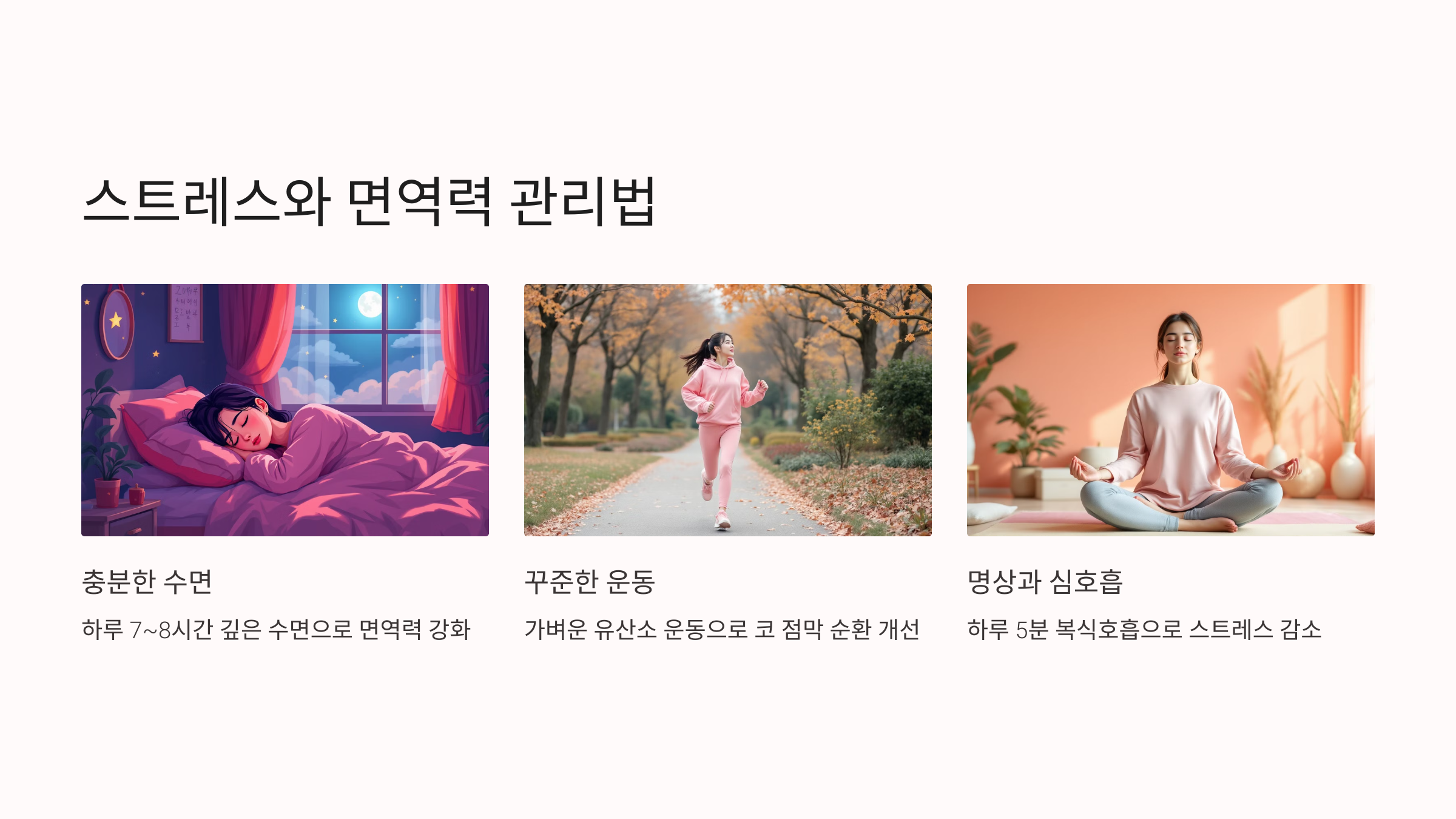세 번째는 명상과 심호흡 같은 정신적 안정법이에요. 짧게라도 아침이나 자기 전 5분 정도 조용히 눈을 감고 복식호흡을 하거나 명상 음악을 듣는 것만으로도 스트레스 수치가 낮아져요. 마음이 편안하면 코도 편안해지죠.