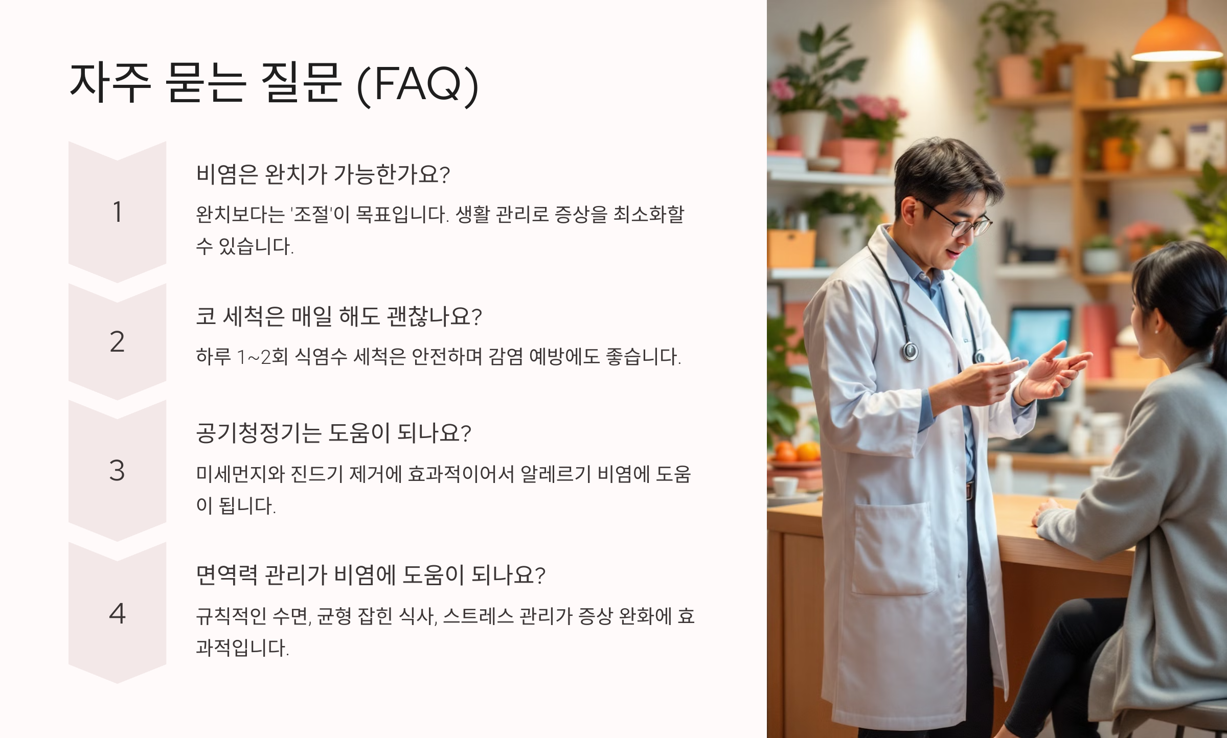 A8. 물론이에요. 규칙적인 수면, 균형 잡힌 식사, 스트레스 관리가 코 점막의 저항력을 높여주고 증상 완화에 효과적이에요.