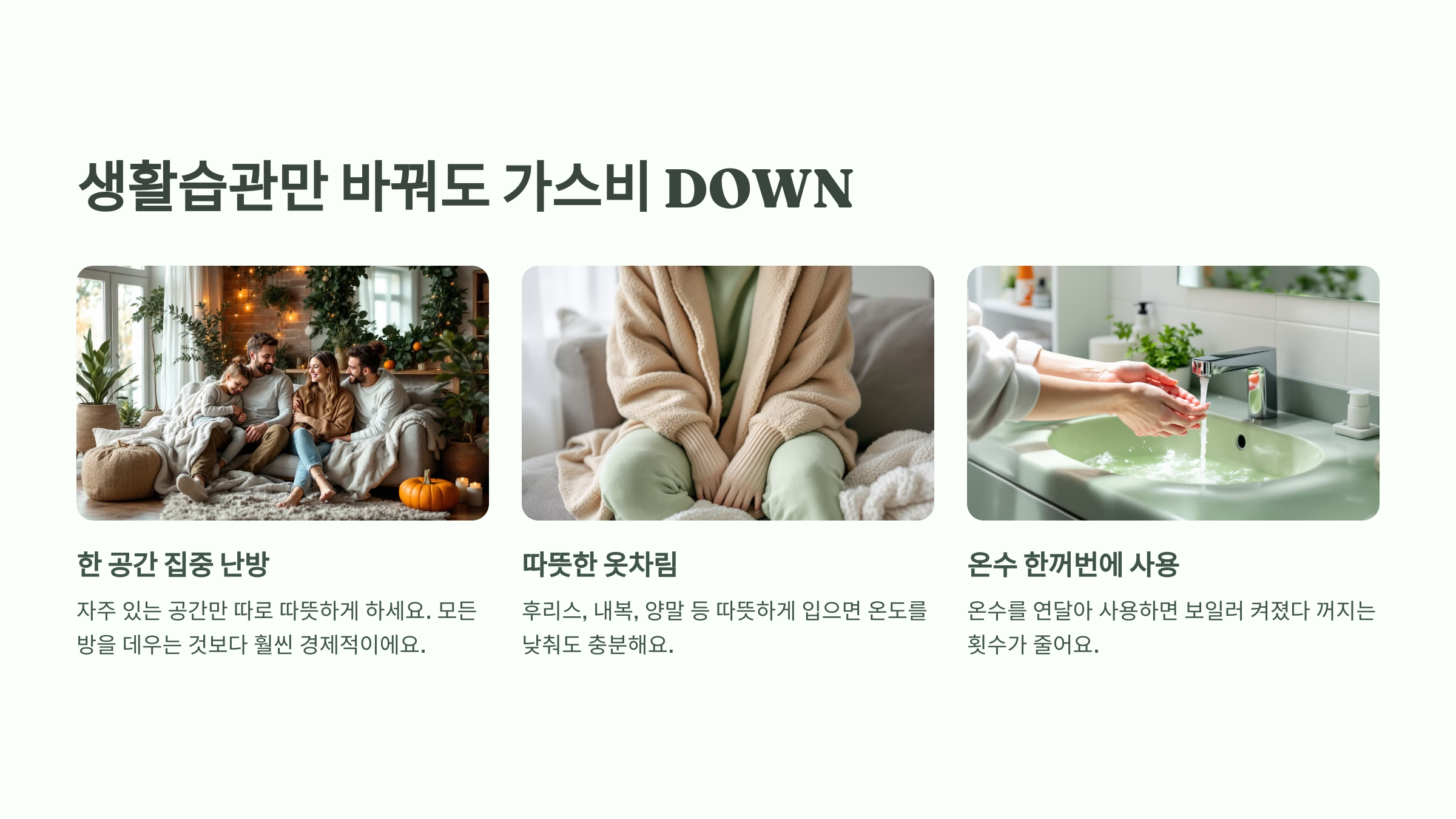 사소해 보이지만, 일상 속 습관 하나하나가 가스비 절약에 큰 영향을 줘요. 아침에 일어나자마자 보일러 빵! 틀고, 샤워는 따뜻하게 오래~ 이런 습관이 모이면 한 달에 수 만 원 차이도 날 수 있어요.