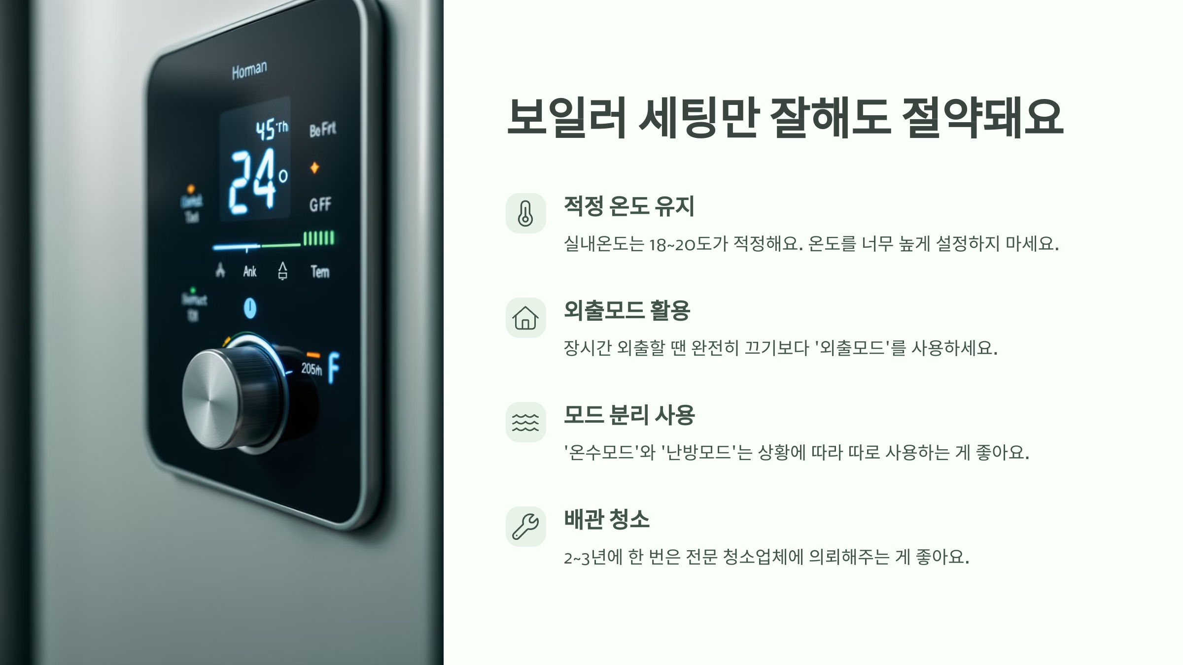 ‘온수모드’와 ‘난방모드’는 상황에 따라 따로 사용하는 게 좋아요. 예를 들어 물만 쓰는 낮 시간에는 난방을 끄고 온수만 틀어놓는 식으로 말이에요. 둘 다 동시에 돌리면 가스 사용량이 확 늘어요. 꼭 분리해서 쓰는 습관 들여보세요!