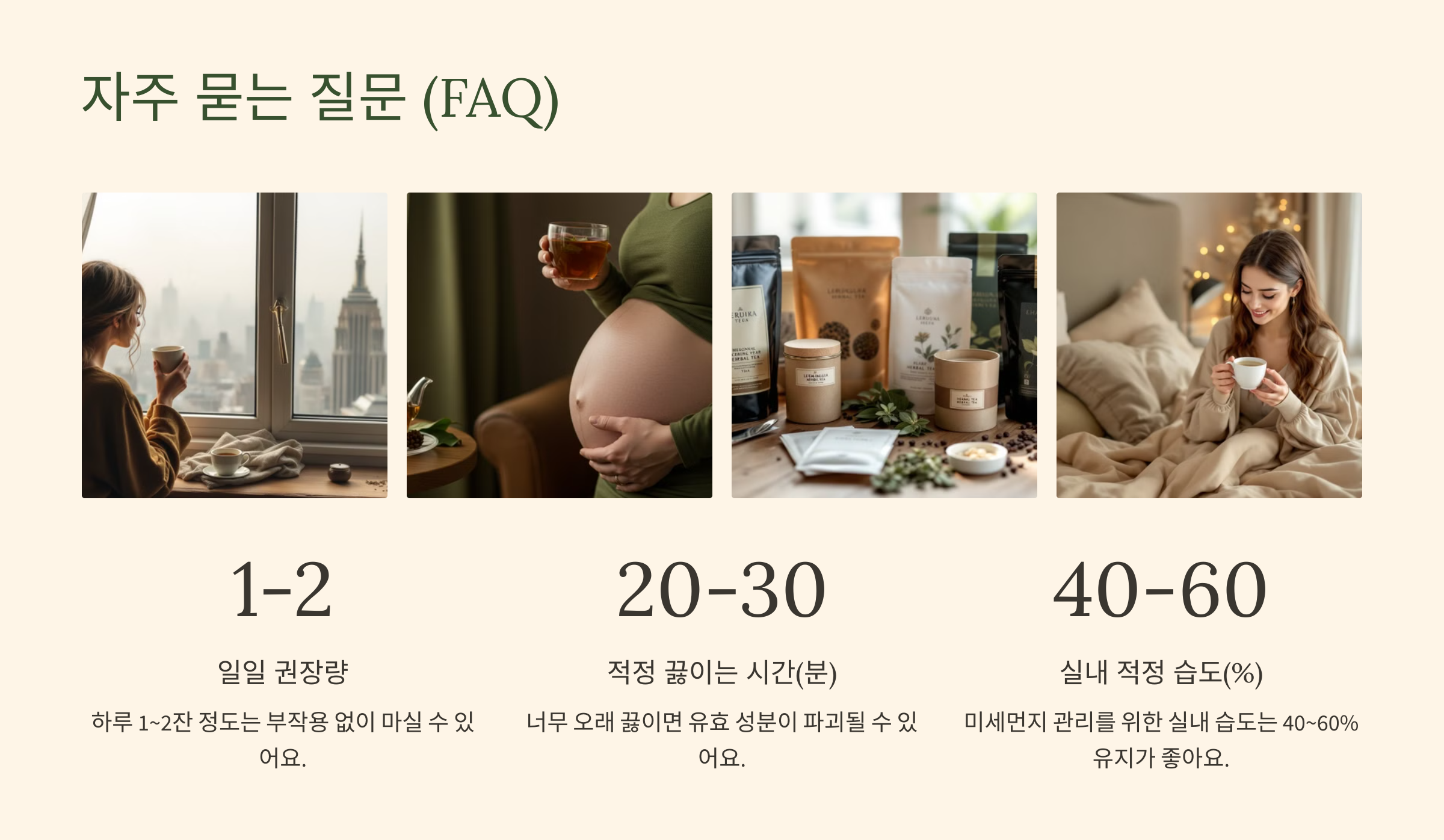 이제 마지막으로, 많은 분들이 궁금해하시는 미세먼지&한방차 관련 자주 묻는 질문들을 FAQ로 정리해볼게요 🙋♀️