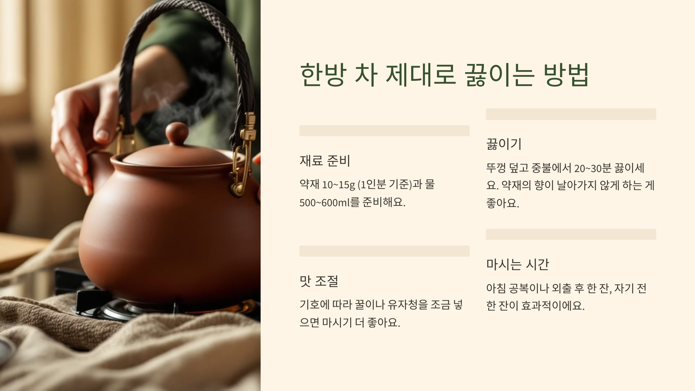 한방 차는 어떻게 끓이느냐에 따라 맛도, 효과도 달라져요. 약재의 성질을 잘 살리면서도 쓴맛은 줄이고, 몸에 부드럽게 스며들게 하는 게 핵심이죠!