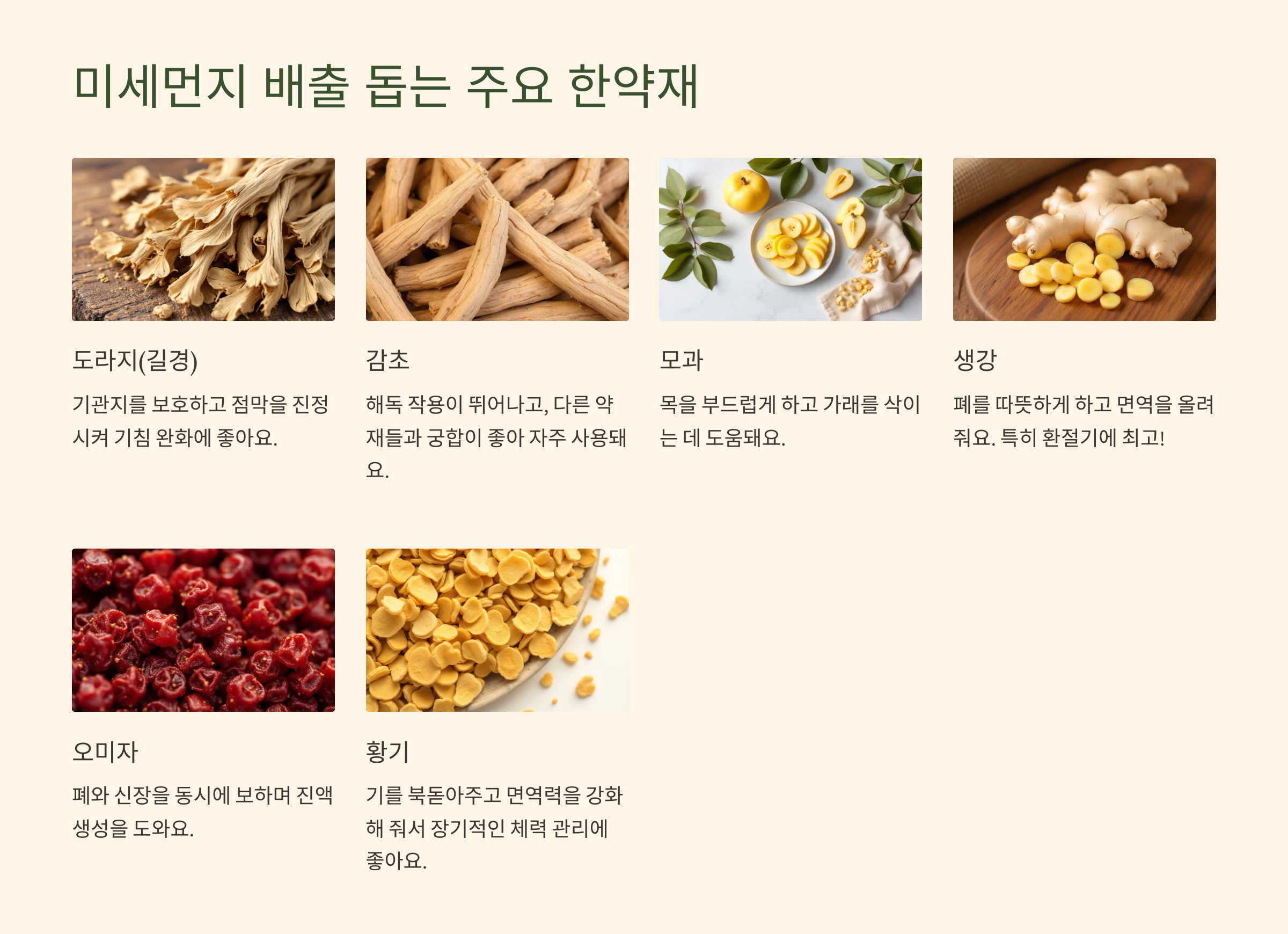 한의학에서는 폐를 보하고 해독 작용을 돕는 여러 가지 한약재가 미세먼지 시대에 특히 주목받고 있어요. 아래는 미세먼지 배출에 효과적인 대표 약재들이에요!