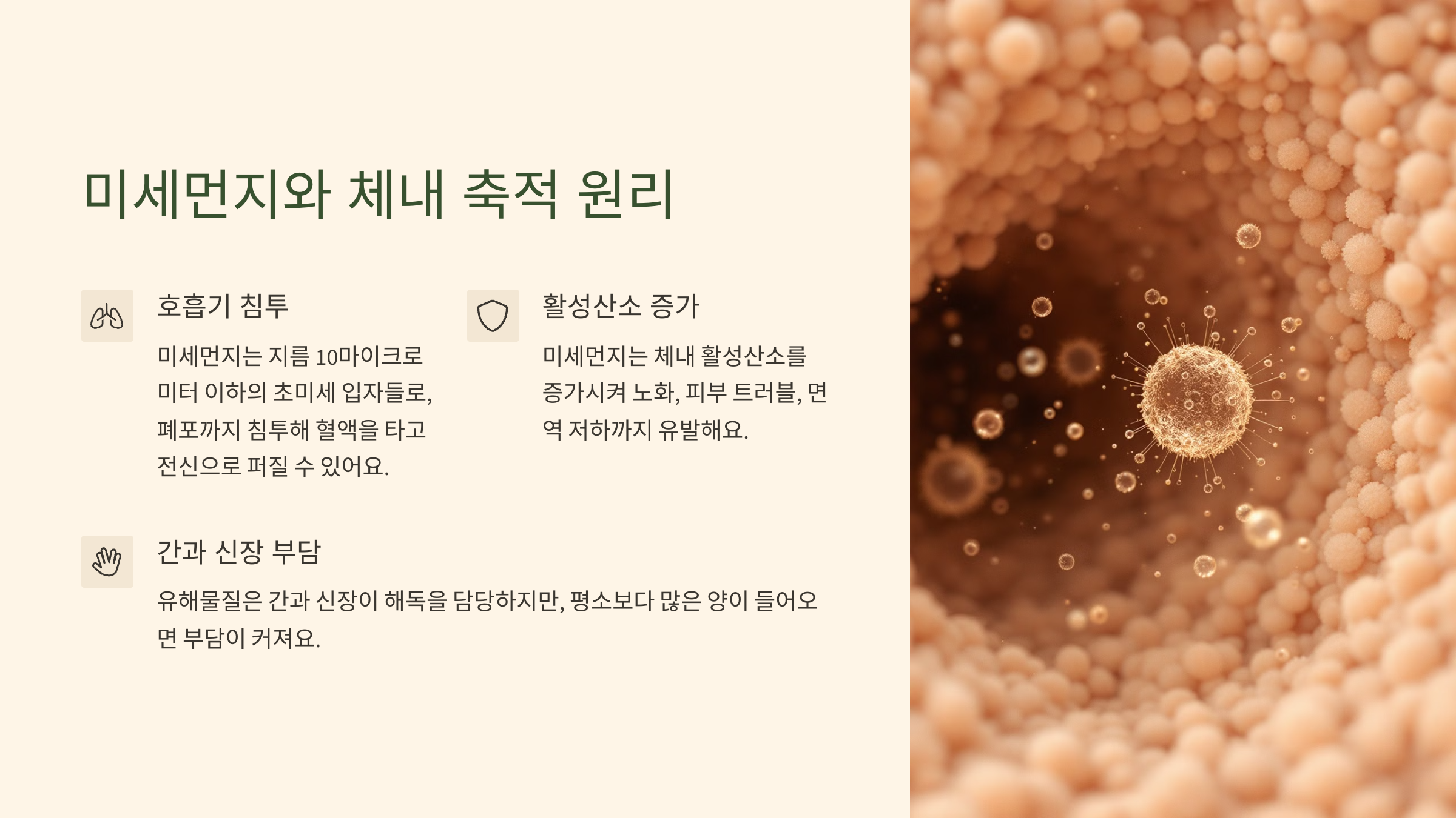 호흡기만 문제 되는 게 아니에요. 미세먼지는 체내 활성산소를 증가시켜 노화, 피부 트러블, 면역 저하까지 유발해요. 피부가 푸석하고 피곤함이 지속되는 것도 실은 미세먼지의 간접 영향일 수 있답니다.