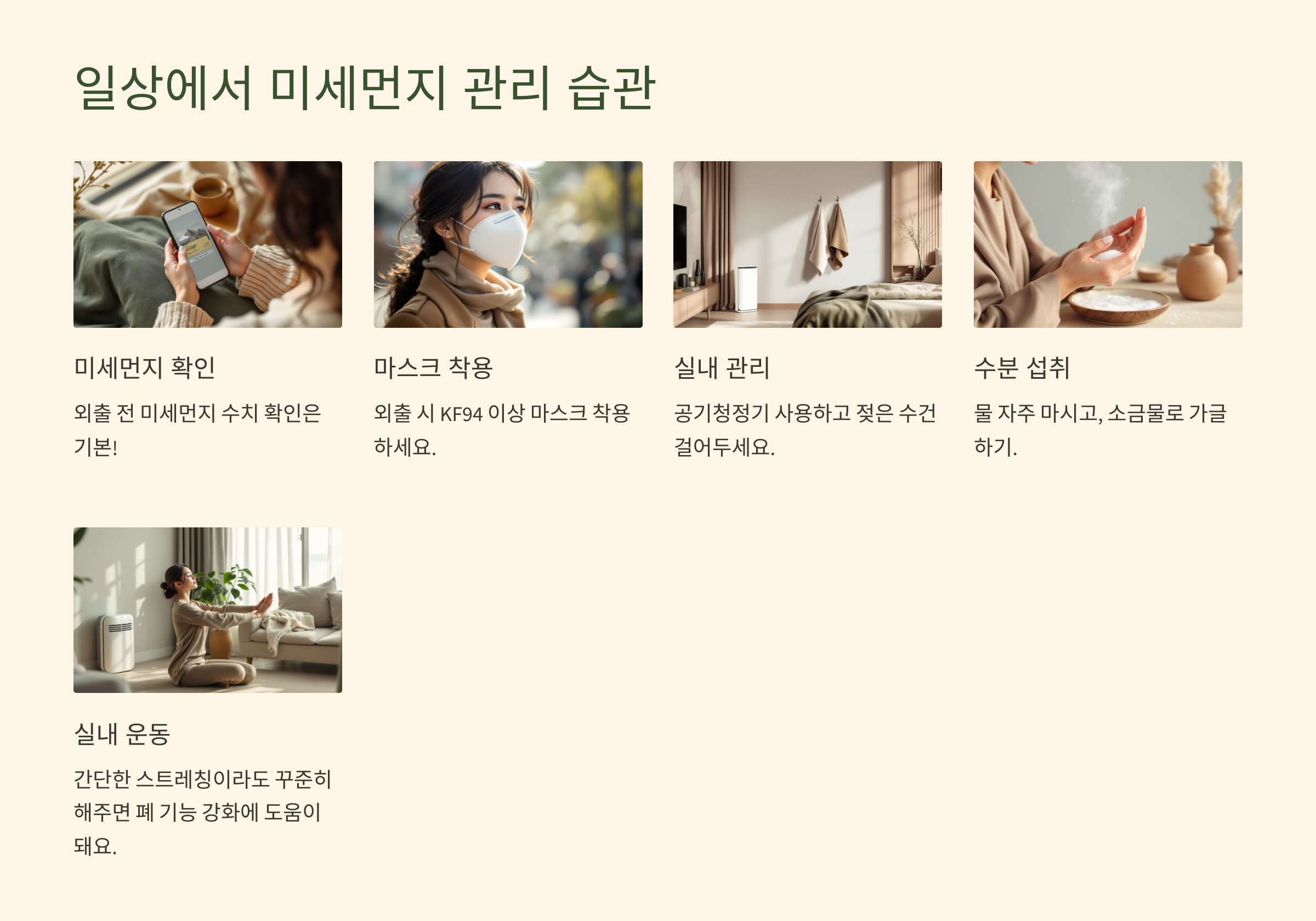미세먼지 심한 날은 실내 운동이나 간단한 스트레칭이라도 꾸준히 해주면 폐 기능 강화에 도움이 된답니다. 몸을 차게 하지 말고 따뜻하게 유지하는 것도 중요해요!