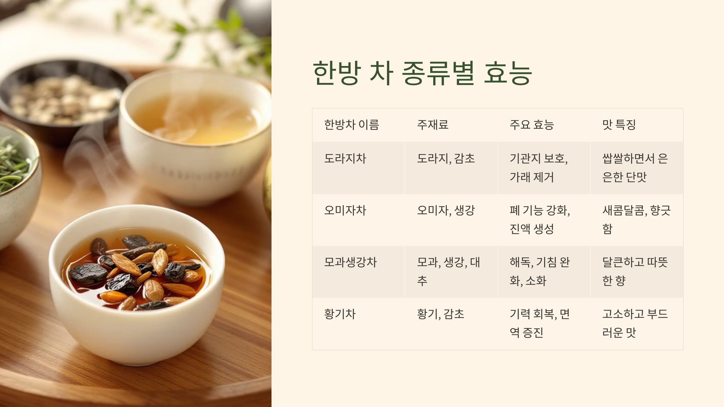 한방차 이름 | 주재료 | 주요 효능 | 맛 특징 |