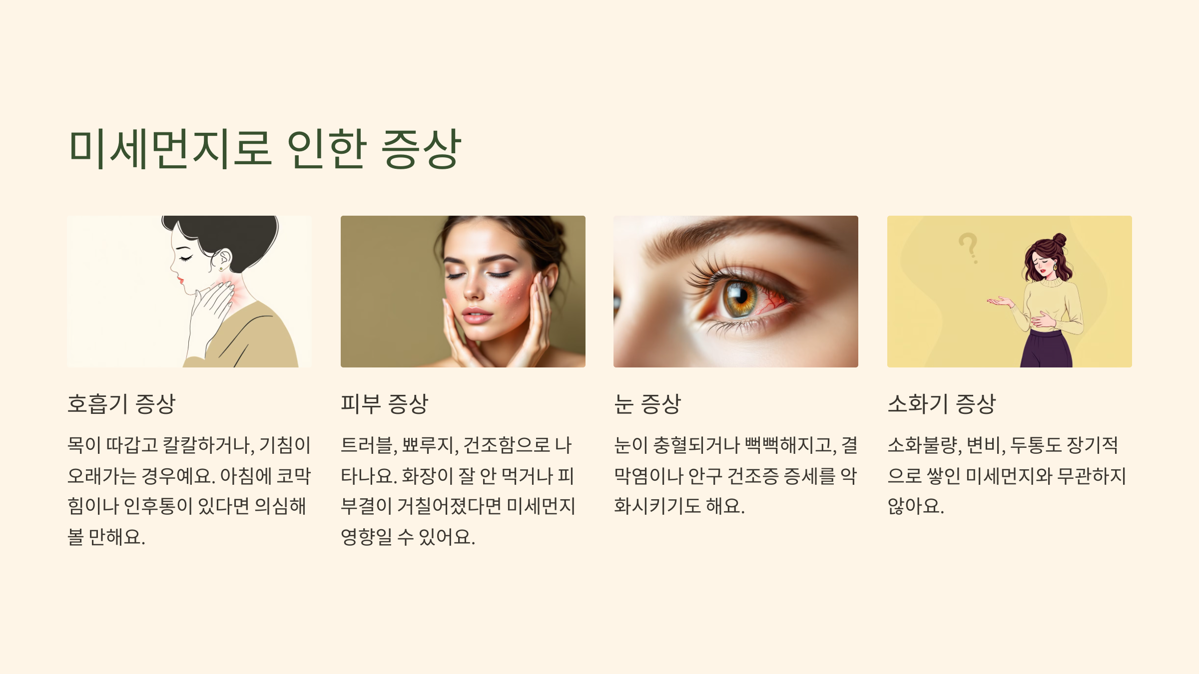 미세먼지가 누적되면 나타나는 증상들을 알고 미리 관리하는 것도 중요해요. 다음은 몸이 보내는 미세먼지 신호에 대해 알아볼게요.