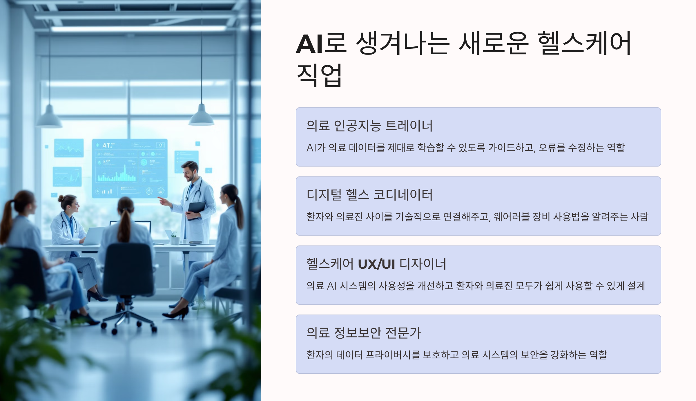 AI 헬스케어가 발전하면서 과거에는 없었던 신직업들이 등장하고 있어요. 예를 들면 '의료 인공지능 트레이너'는 AI가 의료 데이터를 제대로 학습할 수 있도록 가이드하고, 오류를 수정하는 역할을 해요. 이들은 의학지식과 프로그래밍 지식을 모두 갖춘 전문 인력이랍니다.
