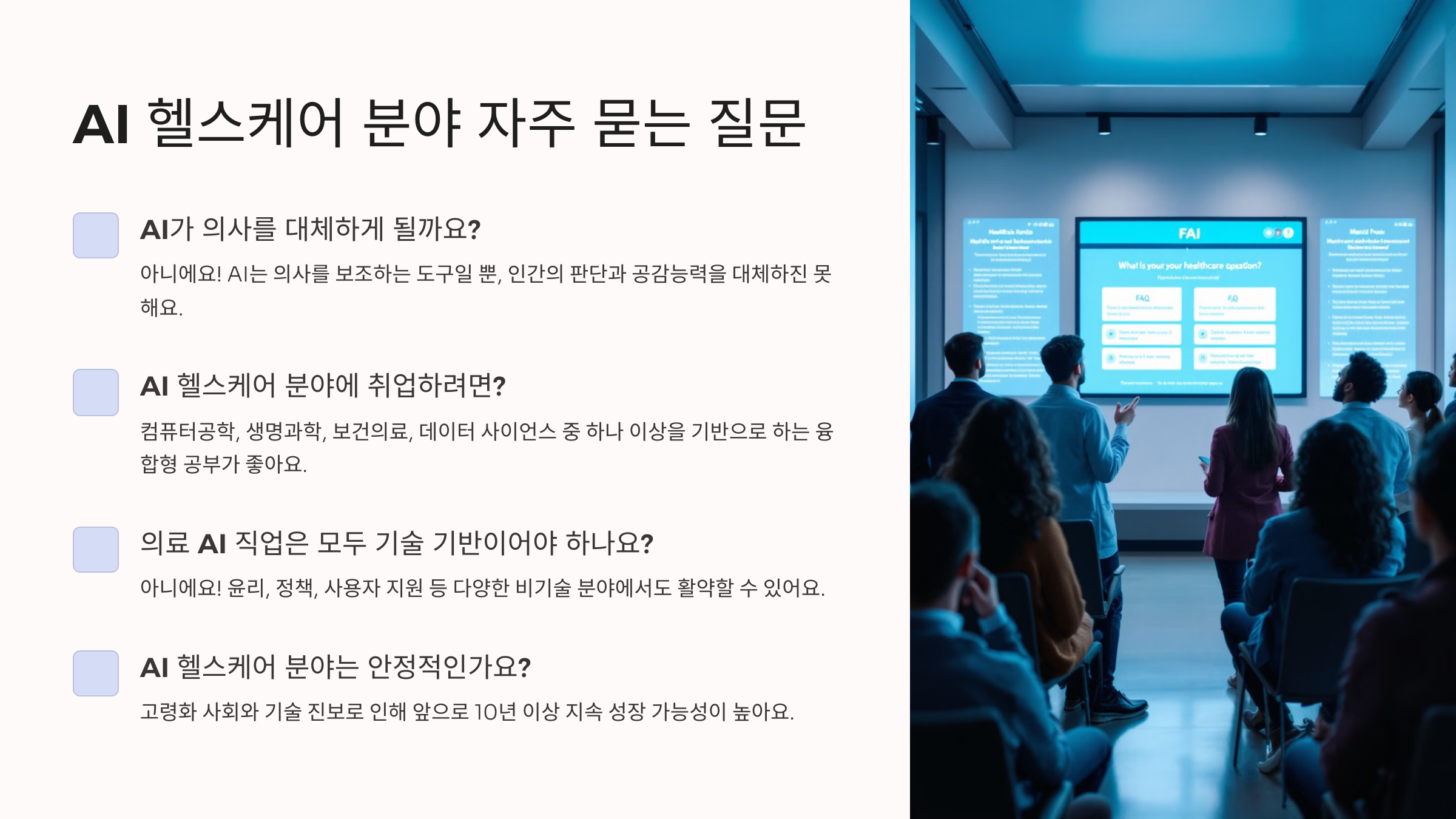 또한, 기존 의료 교육과정에 데이터 사이언스, AI 이해, 디지털 윤리 등의 과목이 포함되고 있어요. 10년 뒤엔 ‘AI를 활용할 줄 아는 의사’가 기본이 될지도 몰라요. 변화는 두렵지만, 준비만 잘 하면 더 넓은 길이 열리는 거예요.