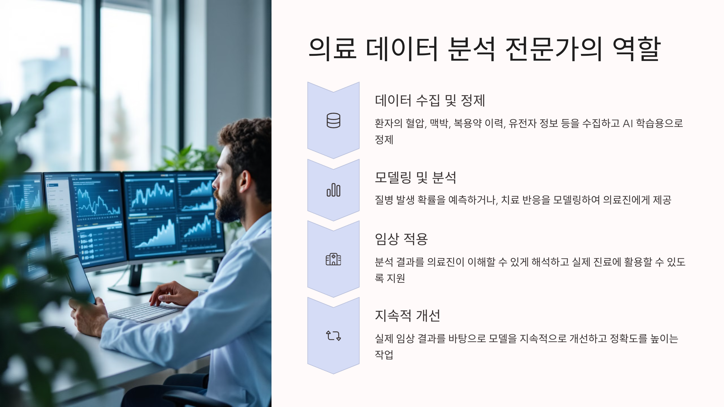 예를 들어, 병원에서 수집한 환자의 혈압, 맥박, 복용약 이력, 유전자 정보 등을 종합해 질병 발생 확률을 예측하거나, 치료 반응을 모델링할 수 있어요. 이 역할은 병원뿐 아니라 제약회사, 보험사, 공공 보건기관에서도 점점 수요가 늘고 있어요.