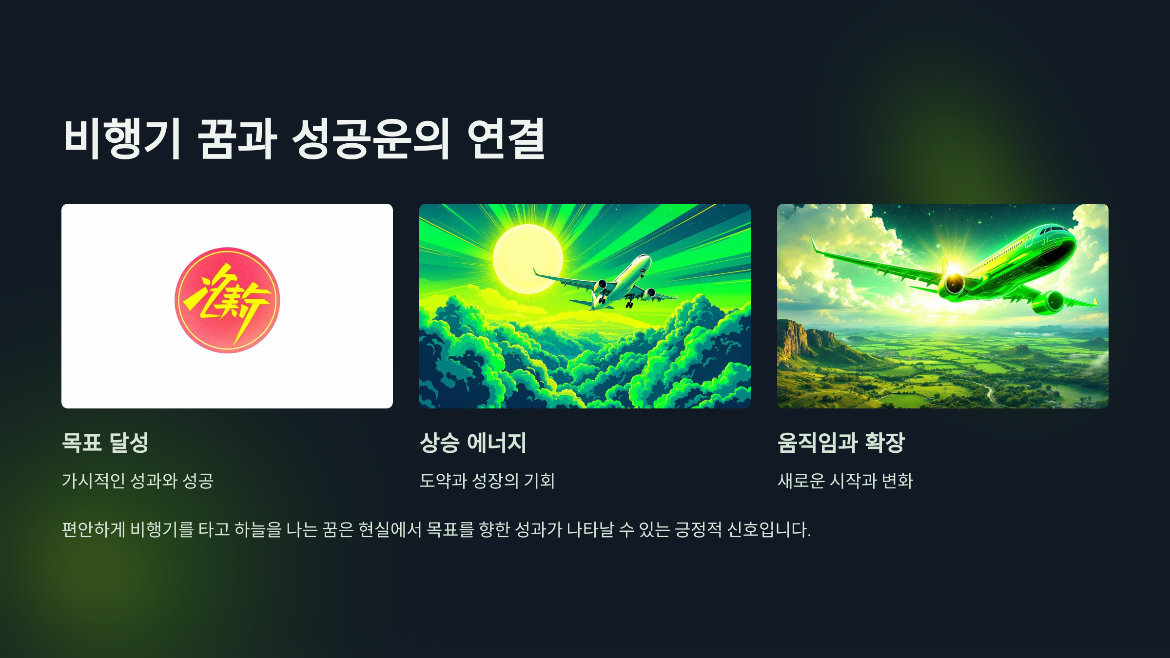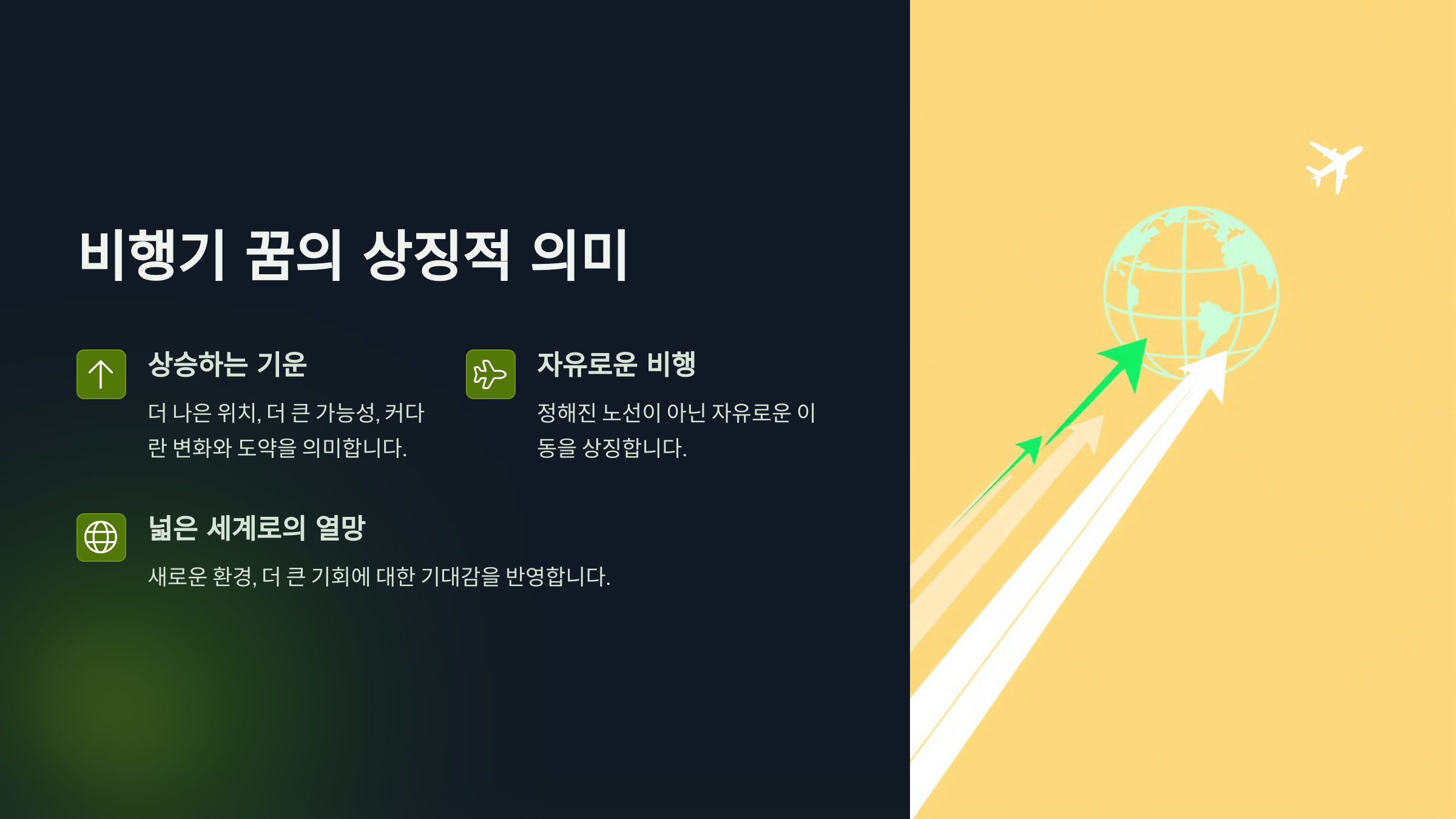 내가 생각했을 때 비행기 꿈은 단순히 “여행 가고 싶은 마음”을 넘어서서, 현재 나의 인생 위치와 도약에 대한 의지를 반영하는 메시지 같아요. 현실에서 뭔가 새로운 걸 시작하거나, 더 높은 곳을 바라보고 있다면 더더욱요!
