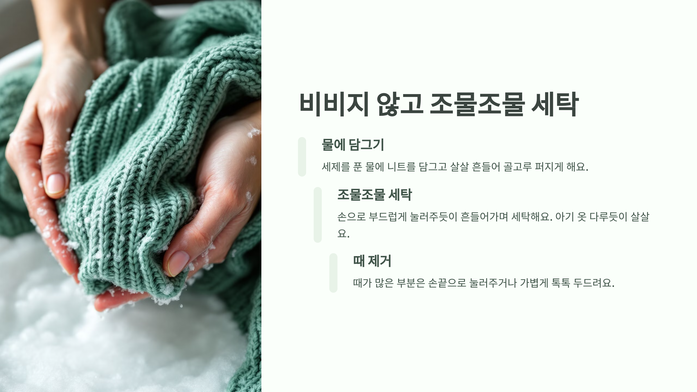 정답은 ‘조물조물’이에요. 손으로 부드럽게 눌러주듯이 흔들어가며 세탁하는 방식이 좋아요. 마치 아기 옷 다루듯이 살살 다뤄야 해요