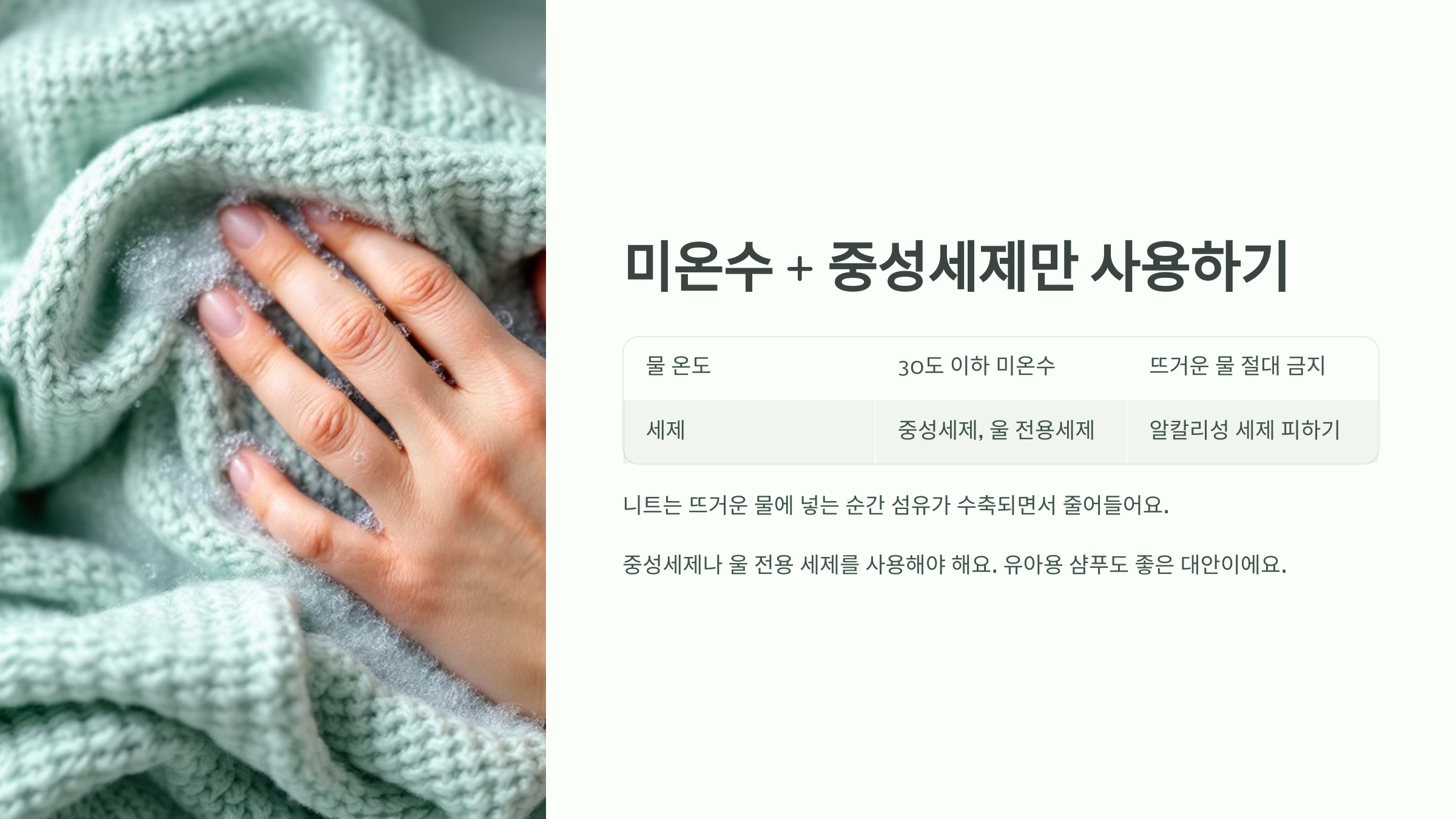 니트는 뜨거운 물에 넣는 순간 섬유가 수축되면서 줄어들어요. 그래서 세탁할 땐 반드시 미지근한 물(30도 이하)만 사용해야 해요