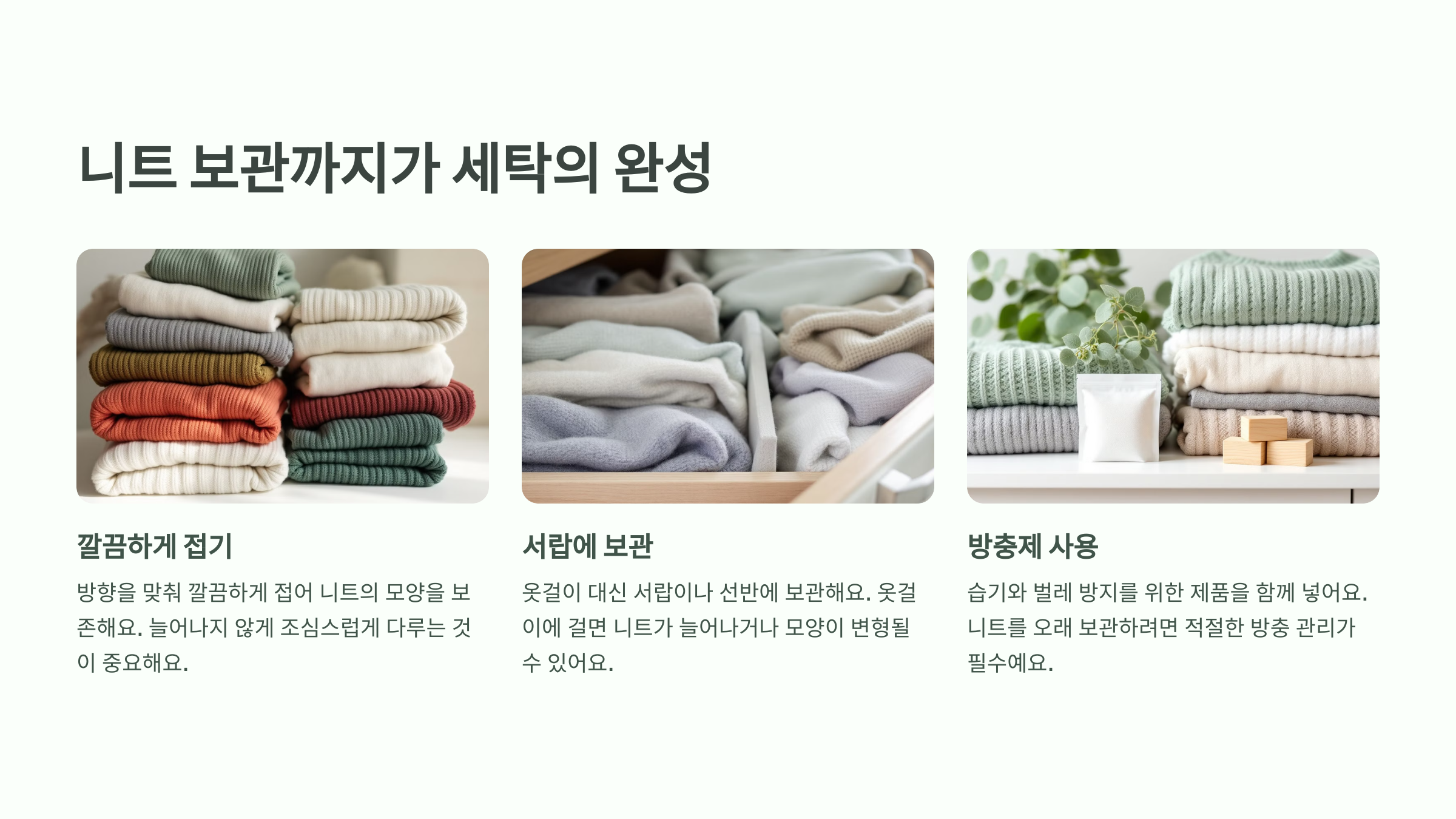 이제 니트 세탁의 핵심 3단계를 알았으니, 마지막으로 보관법까지 마무리해볼게요. 그리고 자주 묻는 질문도 이어서 알려드릴게요
