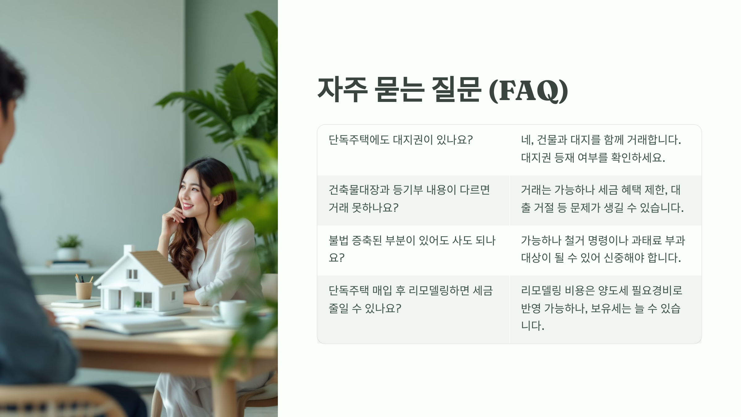 A1. 네. 단독주택은 건물뿐 아니라 그 건물이 올라간 ‘대지’도 함께 거래돼요. 대지권 등재 여부를 반드시 확인해야 해요.