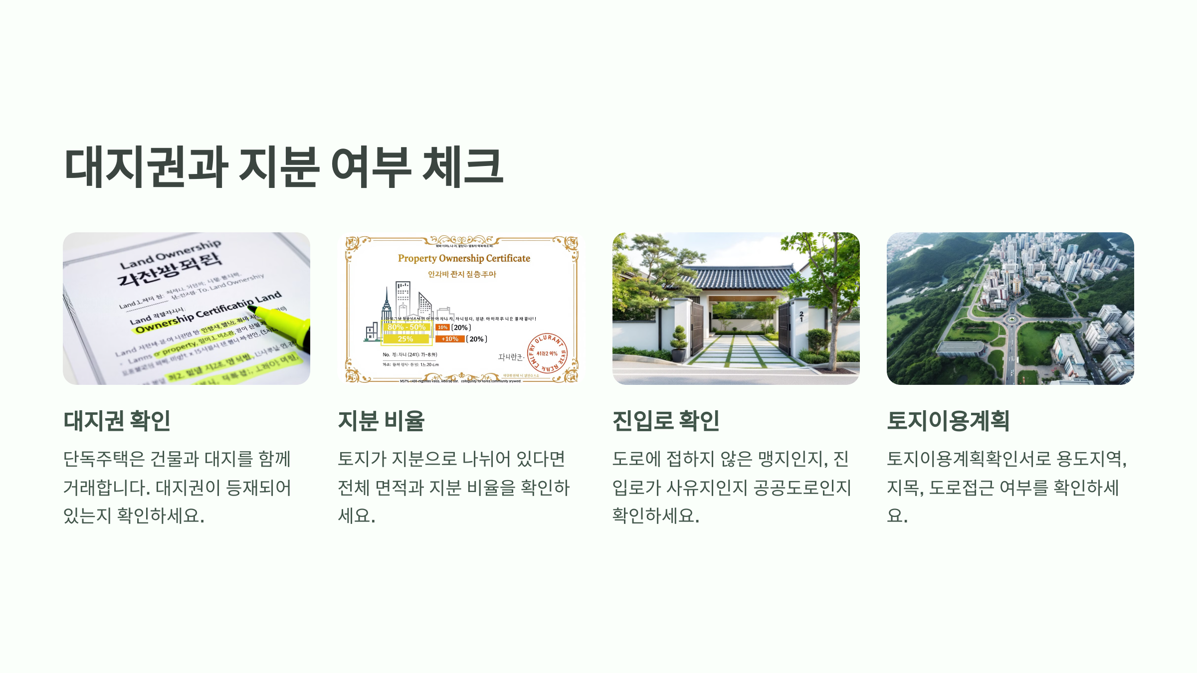 단독주택은 ‘집만’ 사는 게 아니에요. 건물 아래 땅인 ‘대지’도 함께 거래되기 때문에 대지권을 꼭 확인해야 해요. 일부 주택은 건물만 등기돼 있고, 대지권 등재가 안 되어 있는 경우가 있어요. 이 경우 나중에 법적 문제가 생길 수 있어요.