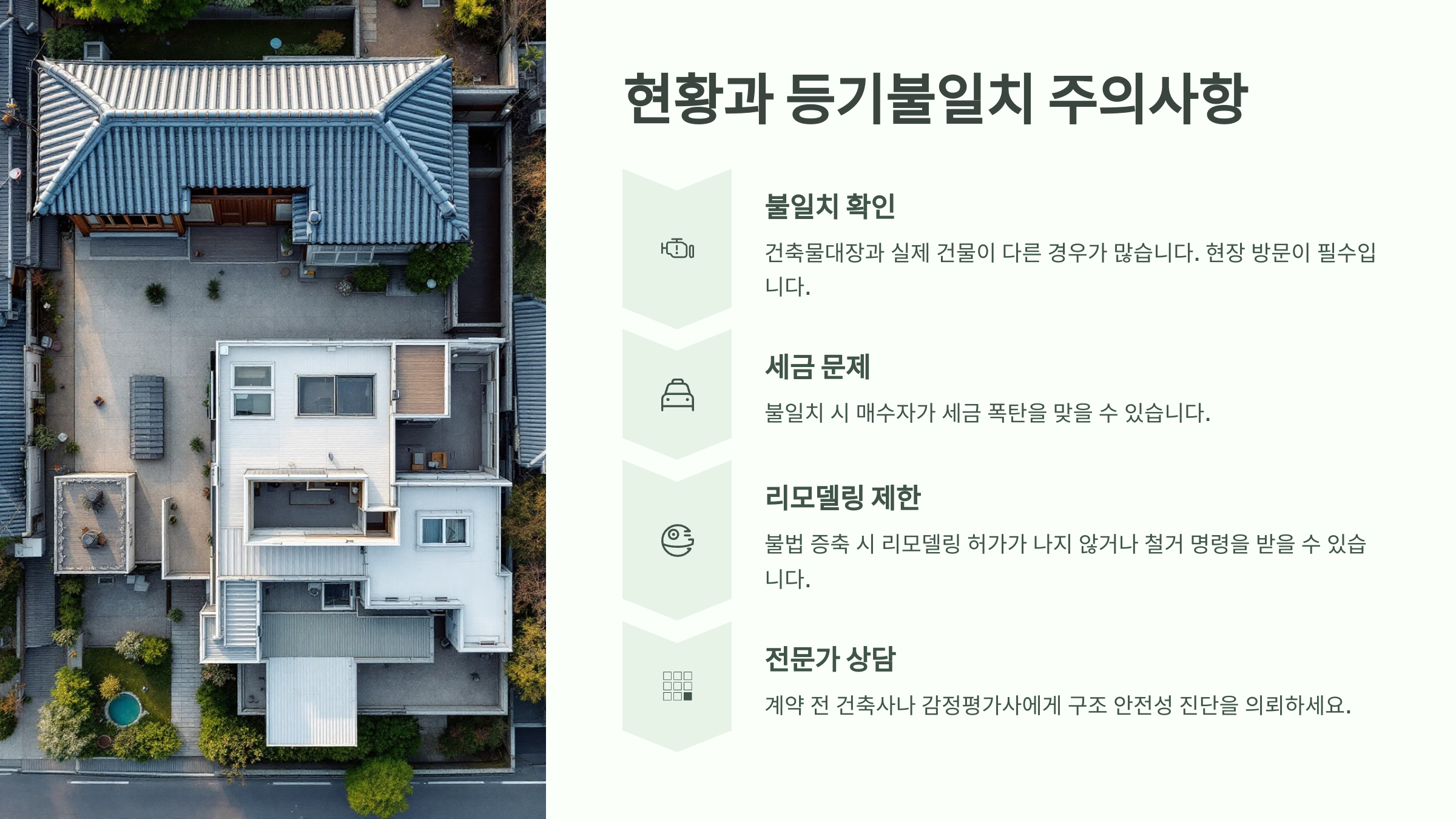 ‘불법’이라는 단어는 무섭지만, 등기와 현황이 일치하지 않는 경우는 실제로 매우 흔해요. 다만 그걸 모른 채 계약하거나, 고지 없이 거래되면 낭패를 보게 되니 반드시 전문가와 함께 체크하는 것이 중요해요.