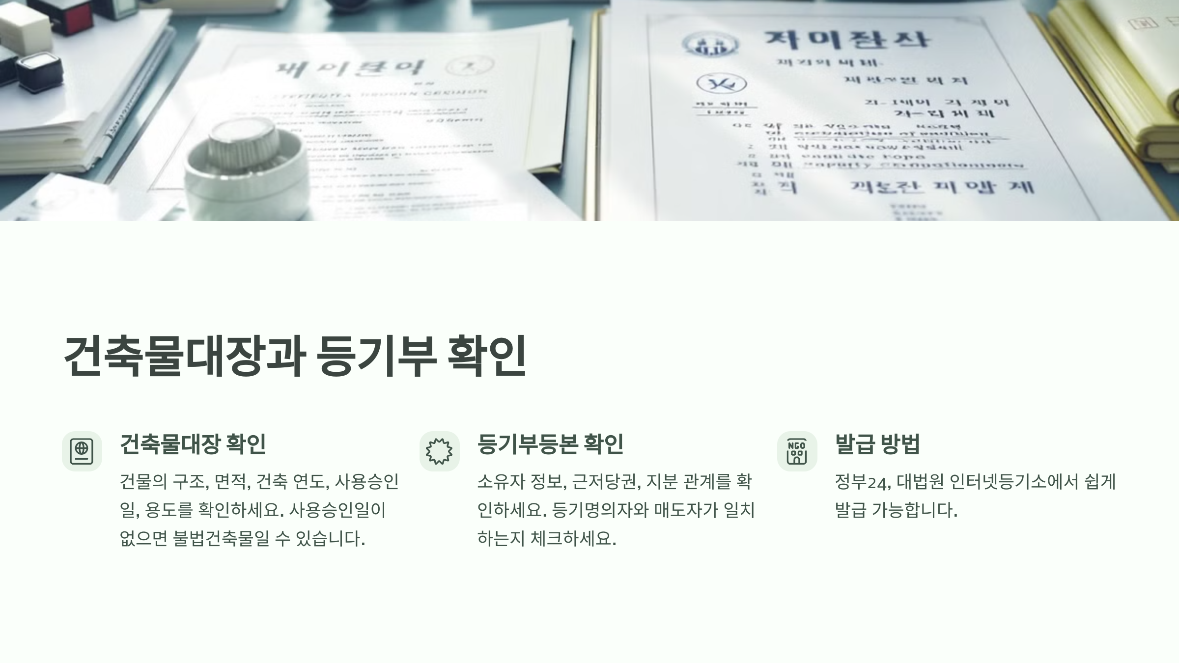 단독주택을 살 때 가장 먼저 해야 할 일은 ‘서류 확인’이에요. 아파트는 비교적 단순하지만, 단독주택은 건축물대장과 등기부등본이 일치하지 않는 경우가 많아서 반드시 양쪽을 다 확인해야 해요.