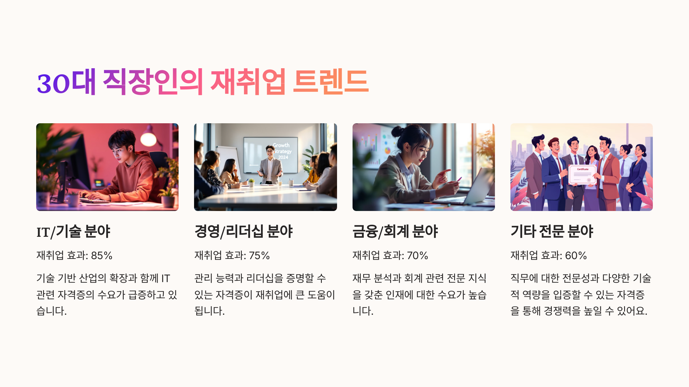 이 글에서는 30대 직장인이 재취업 시 유리하게 활용할 수 있는 자격증 리스트를 분야별로 정리했어요. IT, 경영, 금융 등 다양한 분야에서 취득할 수 있는 자격증들을 소개할 테니, 자신의 경력과 관심사에 맞는 자격증을 취득해보세요.