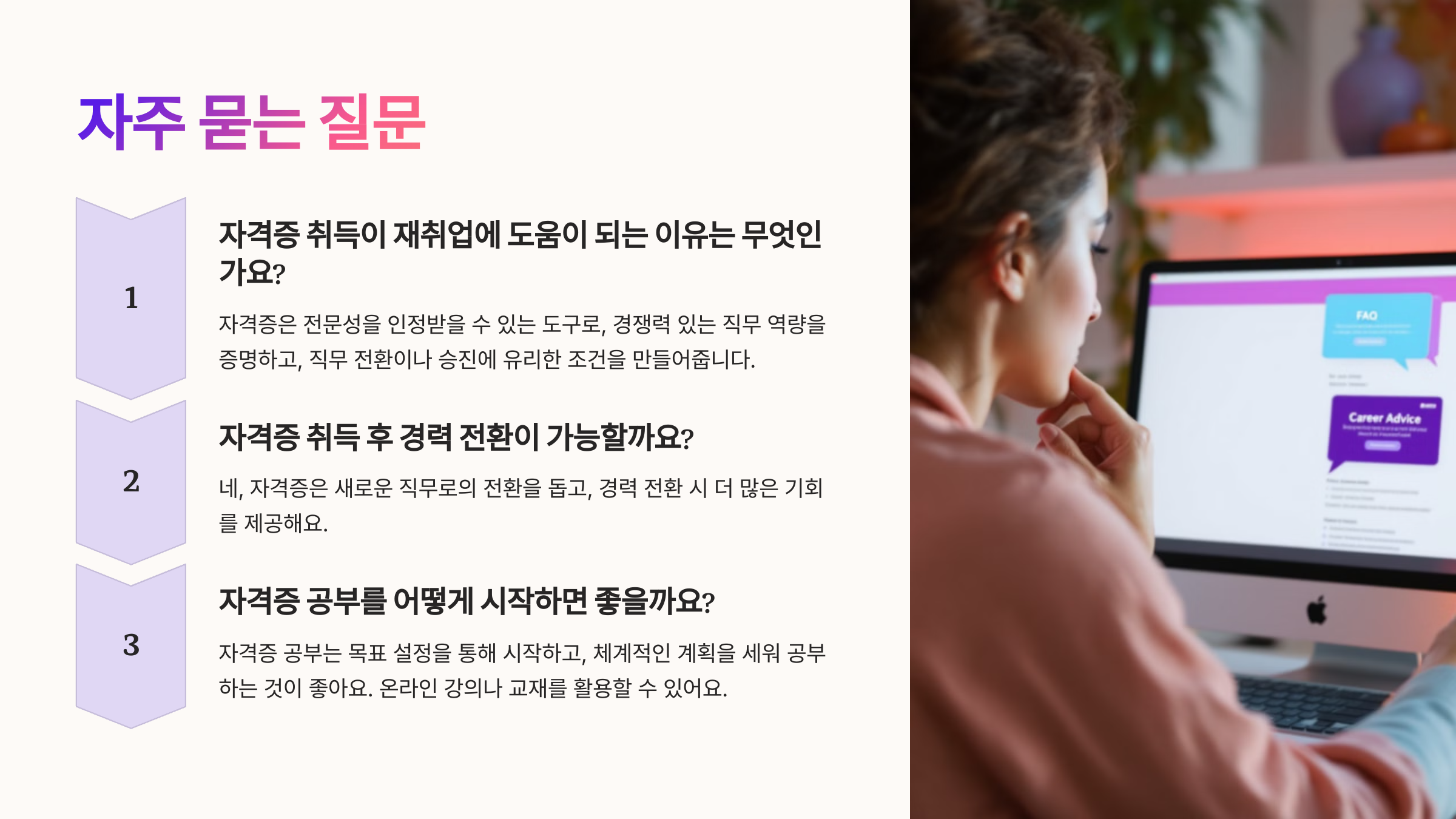 재취업을 위해 자격증을 취득하면, 직무와 관련된 실력을 확실히 증명할 수 있어 경쟁력을 높이고, 직장에서 더 빠르게 자리를 잡을 수 있습니다. 자격증은 또한 고용주에게 직무에 대한 열정과 학습 의지를 보여주는 강력한 신호가 됩니다.