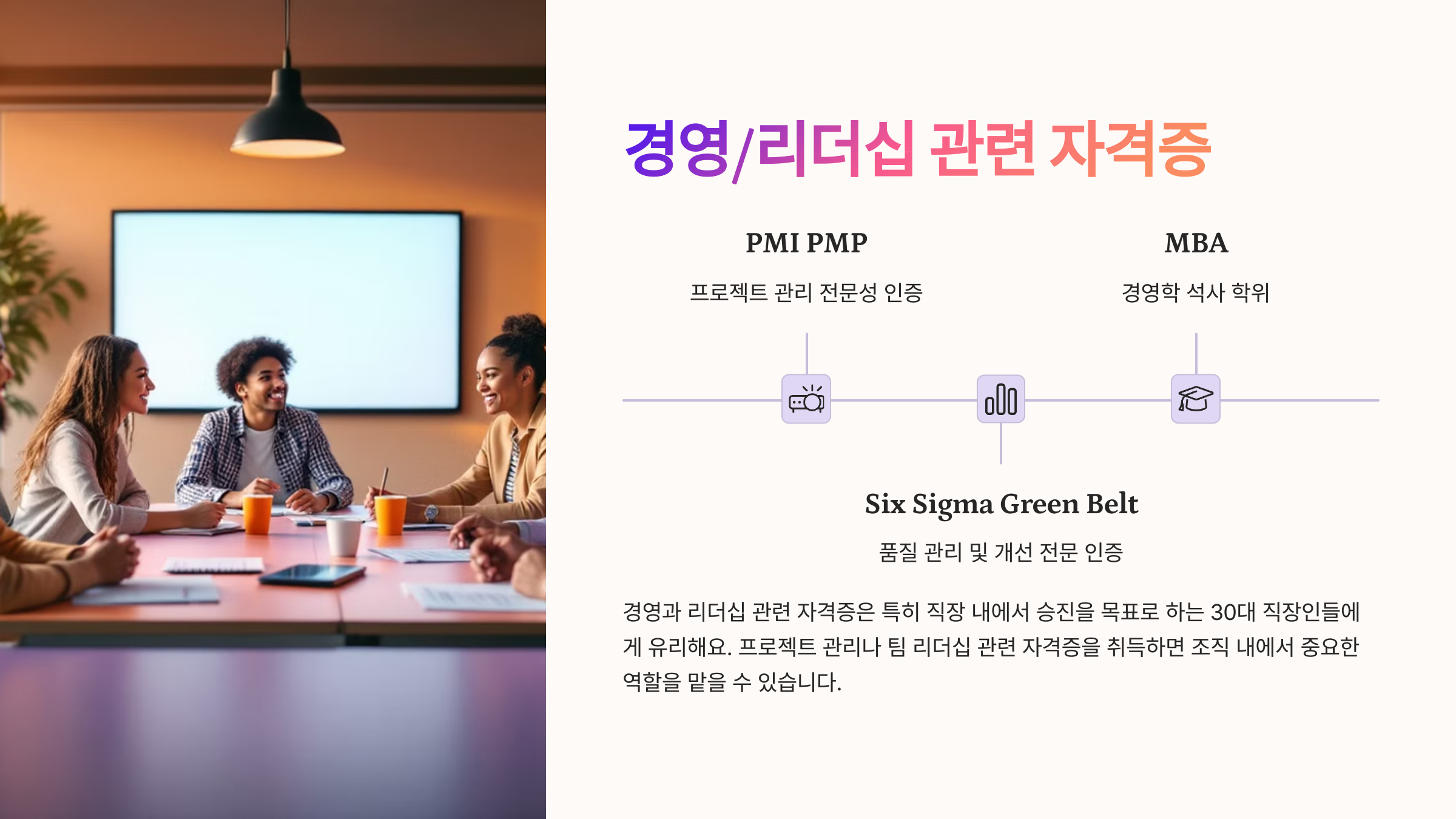 경영과 리더십 관련 자격증은 특히 직장 내에서 승진을 목표로 하는 30대 직장인들에게 유리해요. 프로젝트 관리나 팀 리더십 관련 자격증을 취득하면 조직 내에서 중요한 역할을 맡을 수 있는 기회를 얻을 수 있습니다.