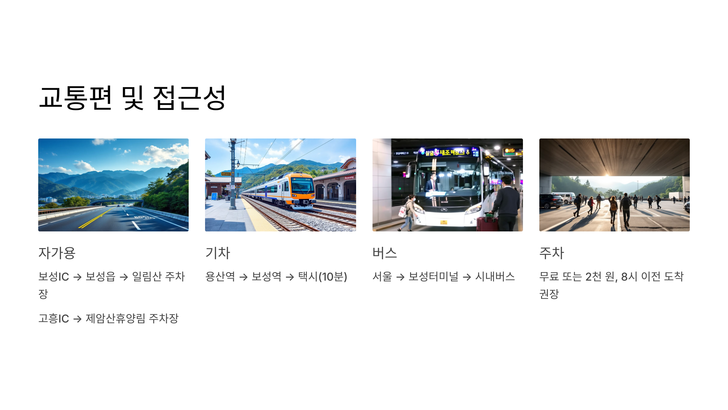 | 고속버스 | 서울 → 보성터미널 | 시내버스 연계 | 약 4.5시간 |