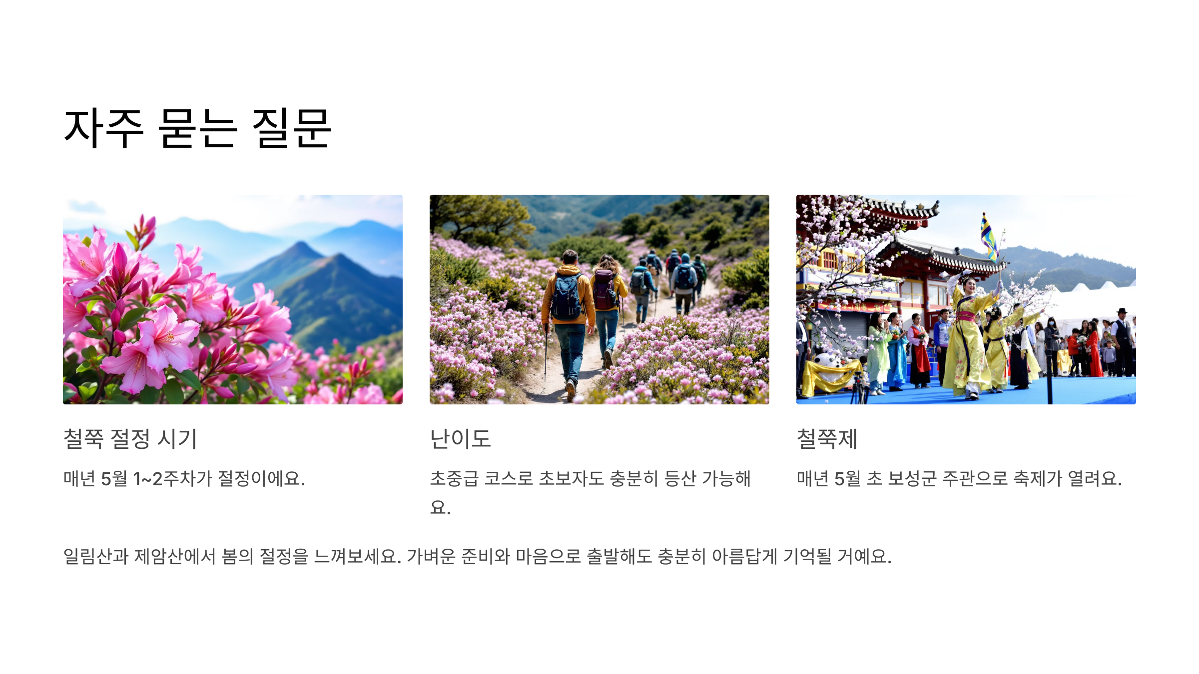 🌸 "언제 가야 제일 예쁜가요?"라는 질문엔 이렇게 답할 수 있어요 → 5월 첫째 주 주말 오전 7시에 일림산에 가세요!