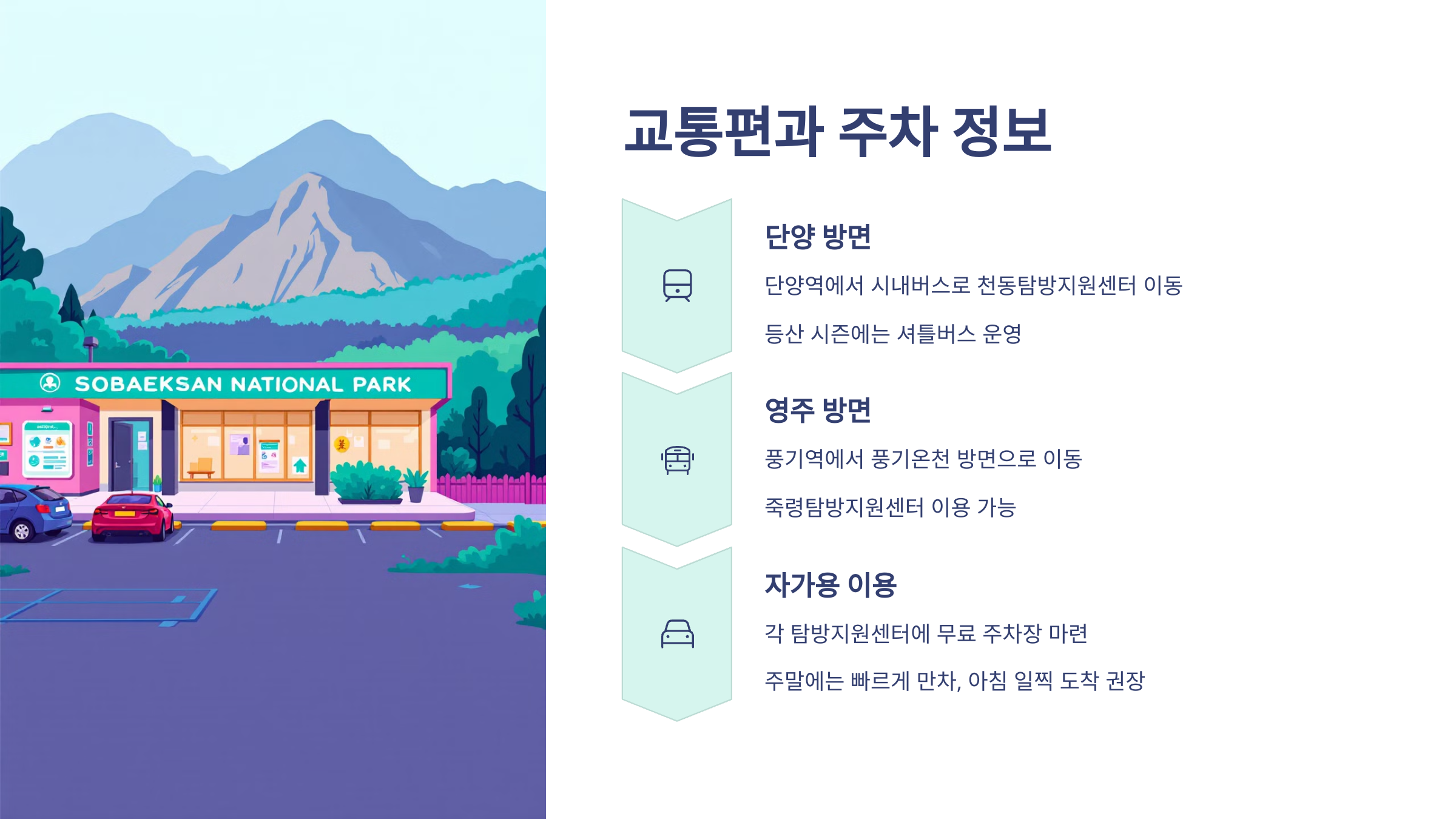 | 죽령 | 풍기역 → 택시 or 버스 | 주말엔 조기 만차 주의 |