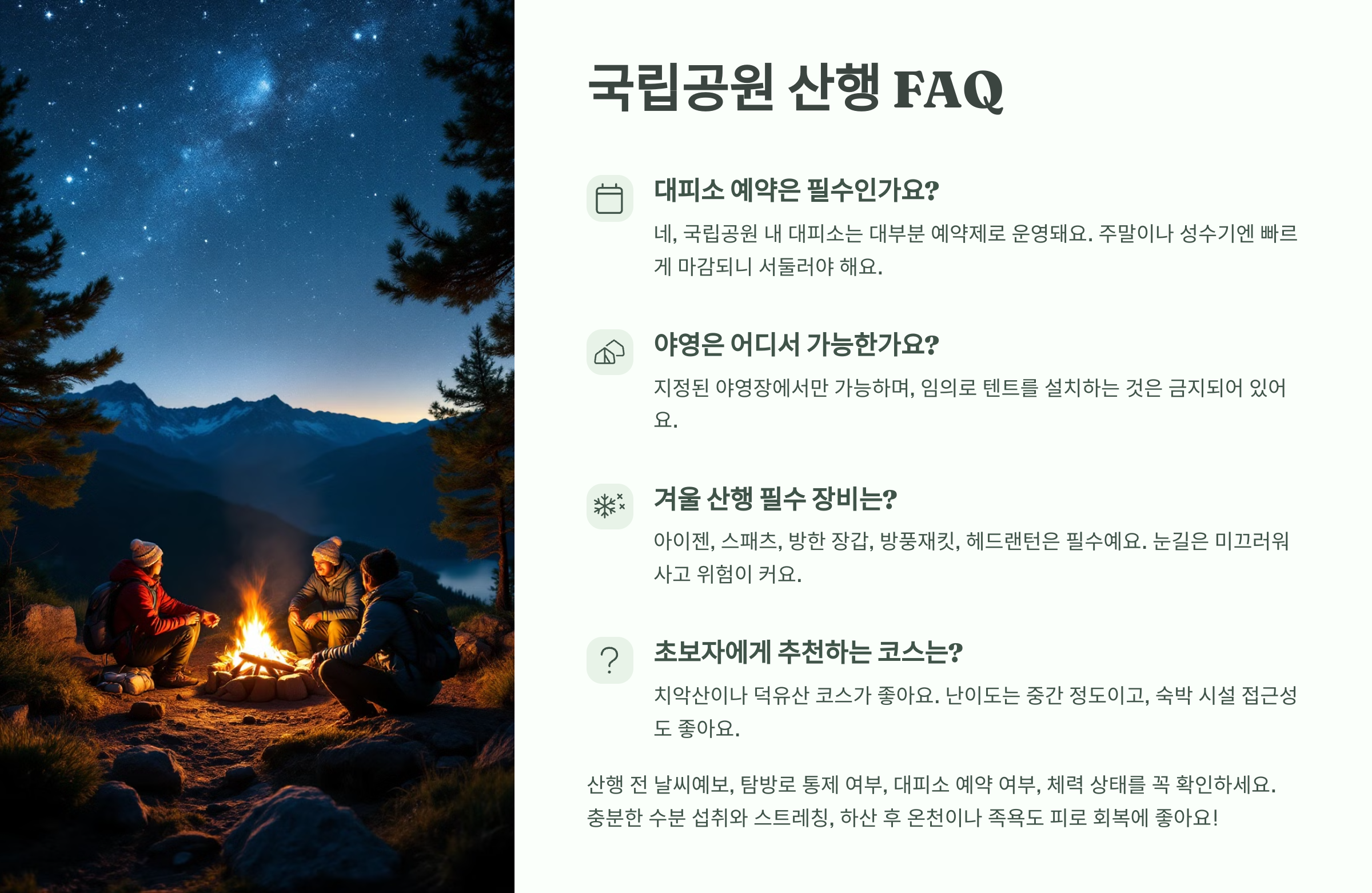 A1. 네, 국립공원 내 대피소는 대부분 예약제로 운영돼요. 국립공원공단 예약 시스템에서 미리 신청해야 하며, 주말이나 성수기엔 빠르게 마감되니 서둘러야 해요.