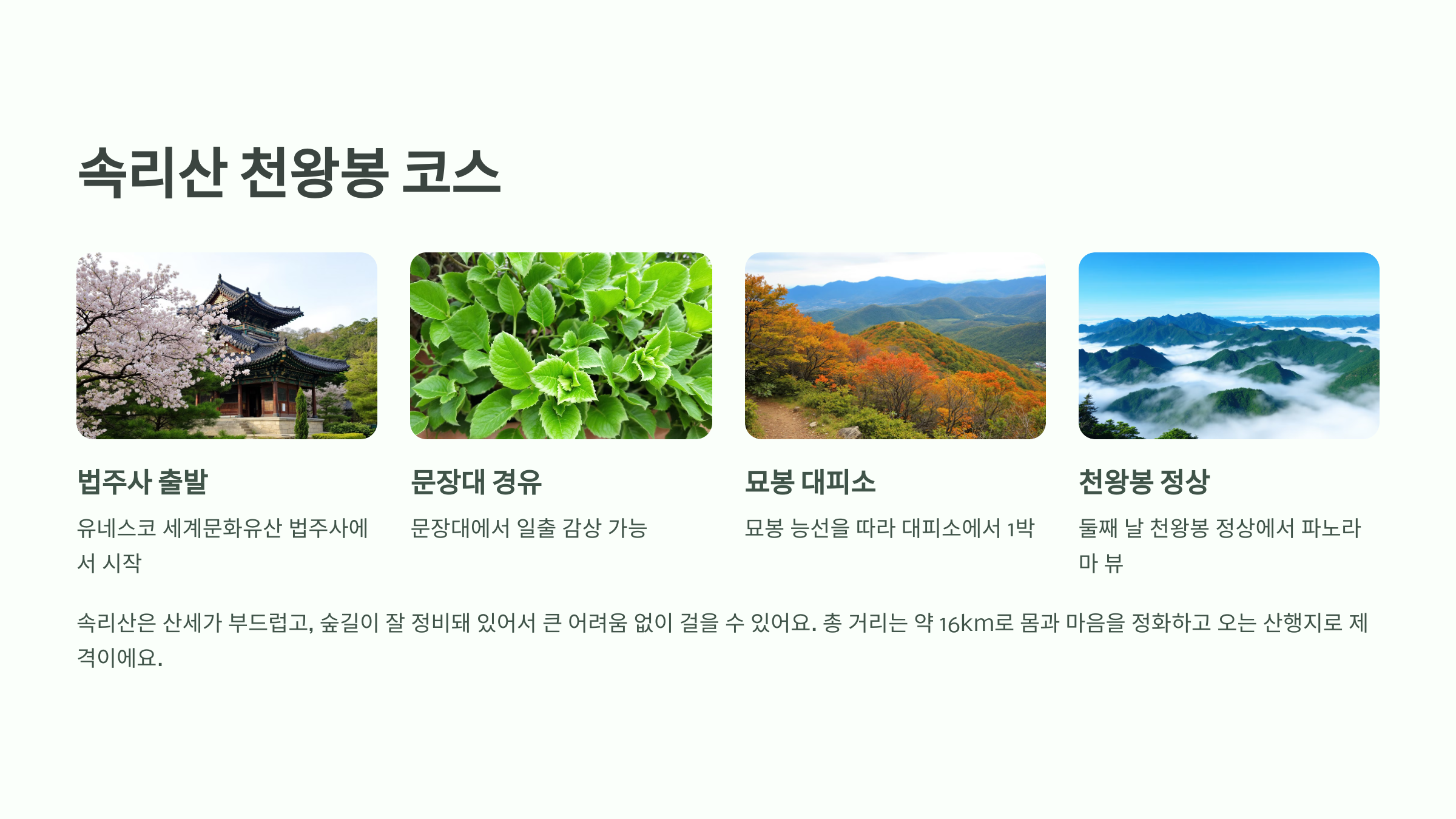 속리산은 산행 난이도가 높지 않으면서도 깊은 숲과 유서 깊은 절, 멋진 조망까지 모두 갖춘 곳이에요. 명상과 쉼이 필요한 분들에게 딱이에요. 천천히 걷는 산행을 좋아한다면 꼭 한 번 다녀와보세요! 🙏