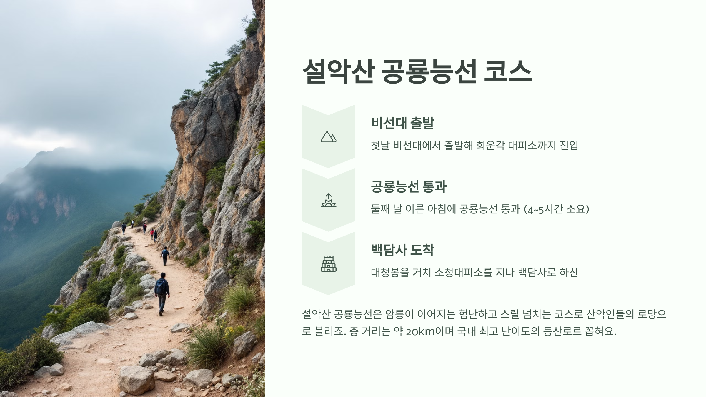 설악산은 강원도의 대표 명산이자, 사계절 내내 아름다운 풍경을 자랑하는 국립공원이에요. 그 중에서도 '공룡능선'은 암릉이 이어지는 험난하고 스릴 넘치는 코스로 산악인들의 로망으로 불리죠. 체력과 날씨, 장비 모두 철저하게 준비되어야 도전할 수 있어요.
