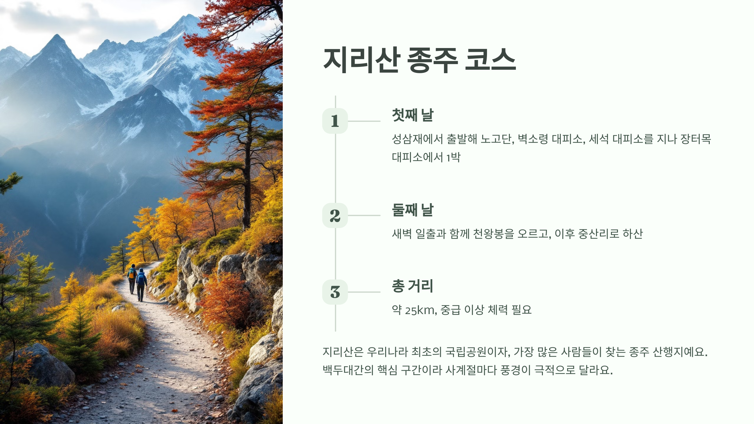 지리산은 우리나라 최초의 국립공원이자, 가장 많은 사람들이 찾는 종주 산행지예요. 1박 2일로 종주할 경우 보통 '성삼재 → 장터목 → 천왕봉 → 중산리' 코스가 가장 많이 이용돼요. 이 코스는 총 길이 약 25km로 중급 이상의 체력을 요구하죠.