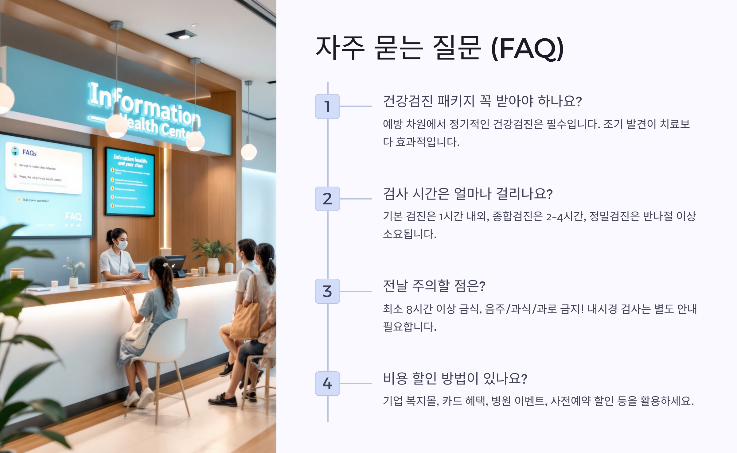 자, 이제 마지막 섹션! 사람들이 진짜 많이 궁금해하는 건강검진 패키지 FAQ로 넘어가볼게요! 바로 출력합니다! 🤗
