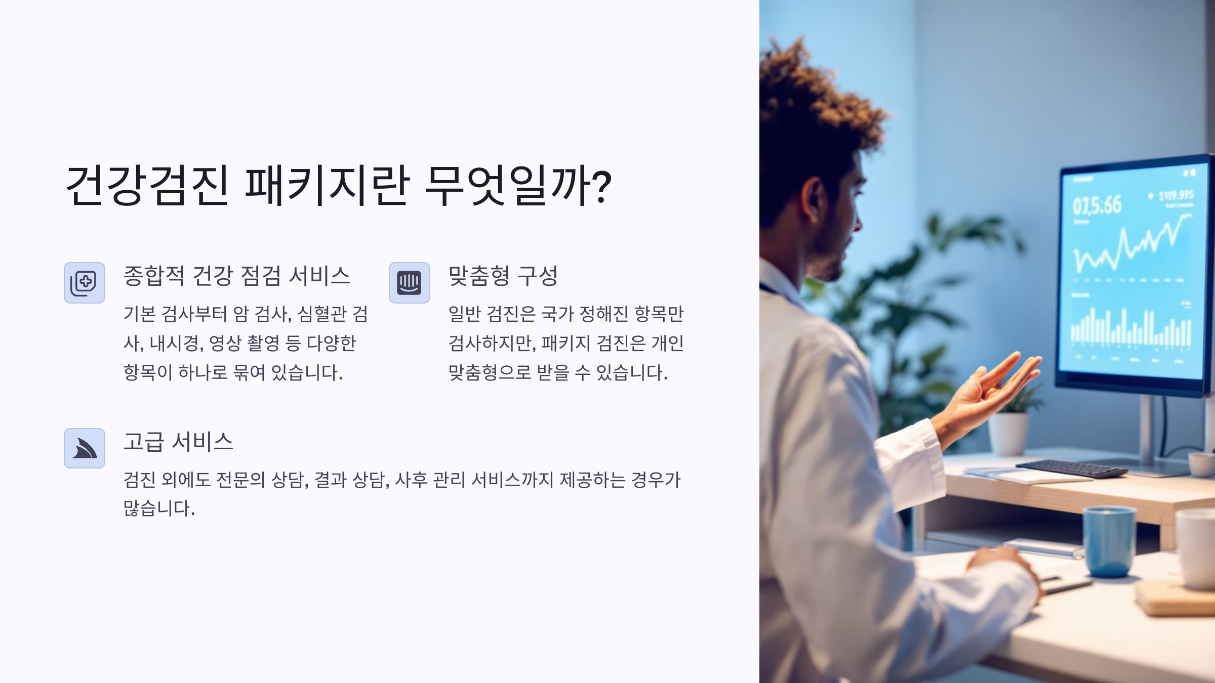 일반 건강검진과 패키지 검진의 가장 큰 차이는 검사 항목 수와 구성 방식이에요. 일반 검진은 국가에서 정해준 항목만 검사하지만, 패키지 검진은 병원이나 검진센터가 독자적으로 설계해서 개인 맞춤형으로 받을 수 있답니다.