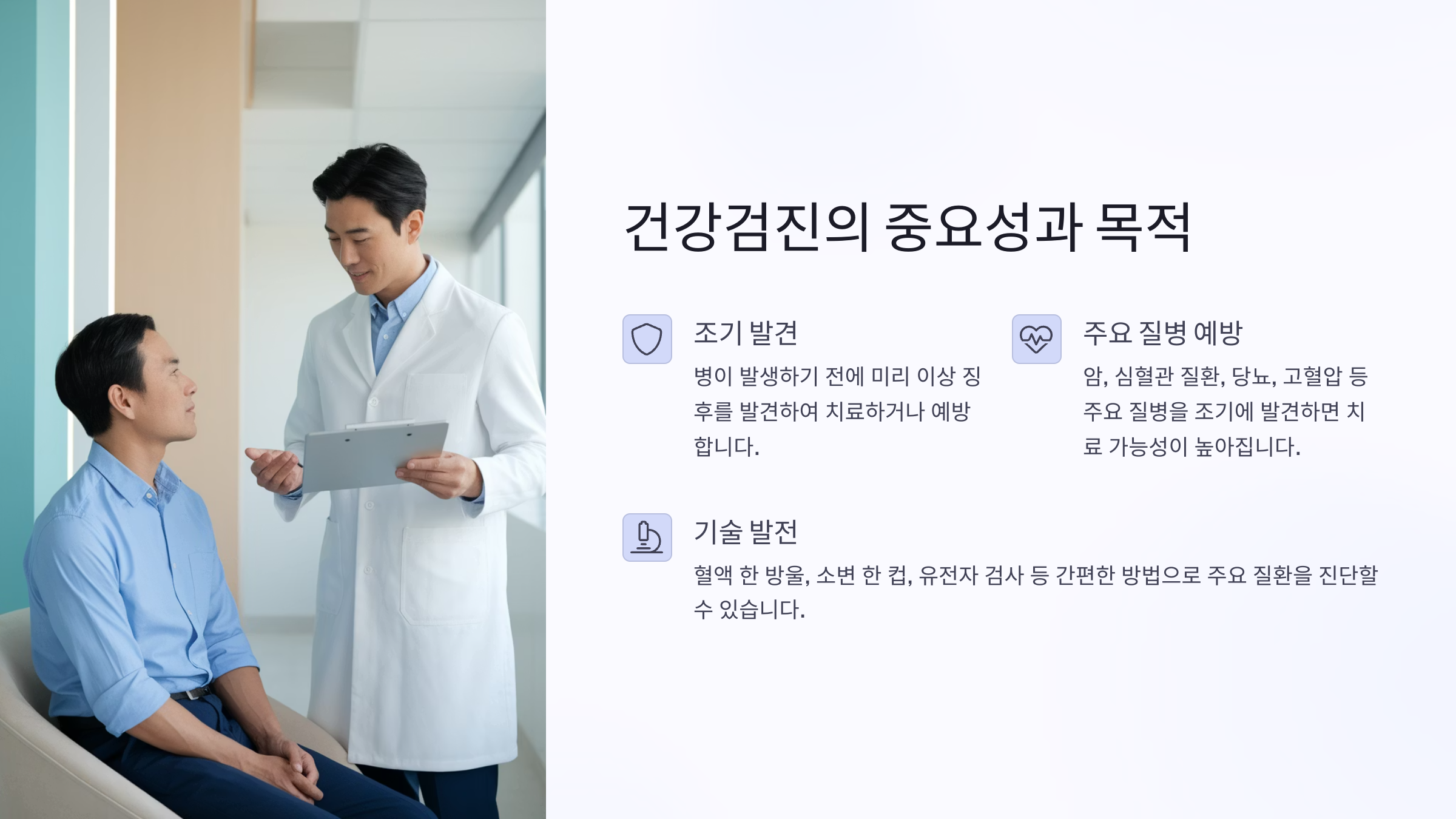 건강검진을 받는 가장 큰 목적은 '조기 발견'과 '예방'이에요. 병이 생기고 나서 치료하는 것보다 미리 확인하고 예방하는 것이 훨씬 경제적이고 효과적이거든요!