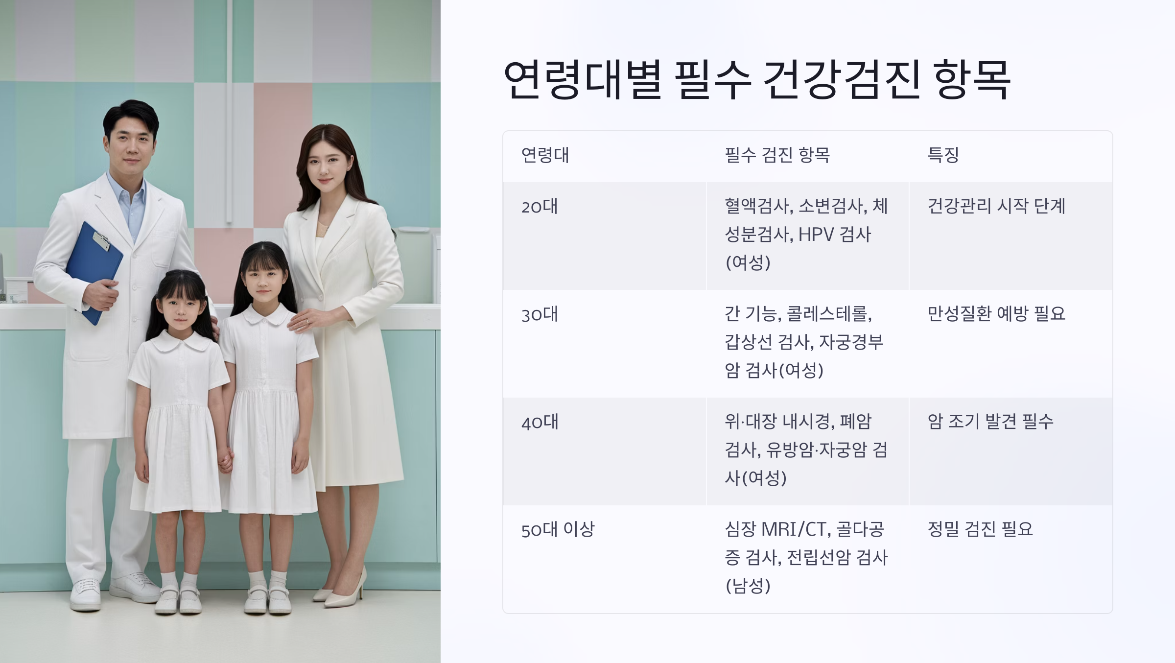 다음 섹션에서는 '연령대별 필수 건강검진 항목'을 소개할게요. 나이에 따라 꼭 받아야 할 검진 리스트가 다르거든요! 놓치면 손해니까 꼭 확인해봐요! 🙌