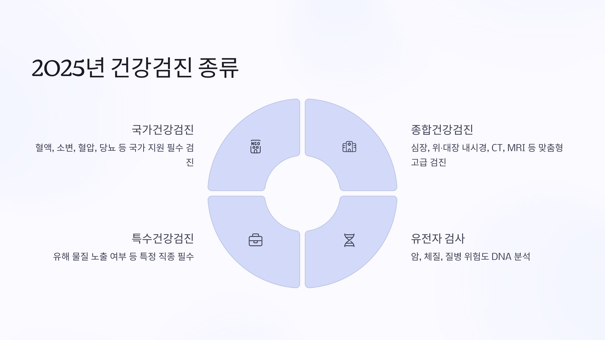 2025년 기준으로 건강검진은 크게 국가건강검진, 직장건강검진, 개인종합검진, 특수검진, 유전자검사, 프리미엄검진 등으로 나눌 수 있어요. 각각의 특징과 혜택이 달라서 나에게 맞는 검진을 선택하는 게 정말 중요해요.