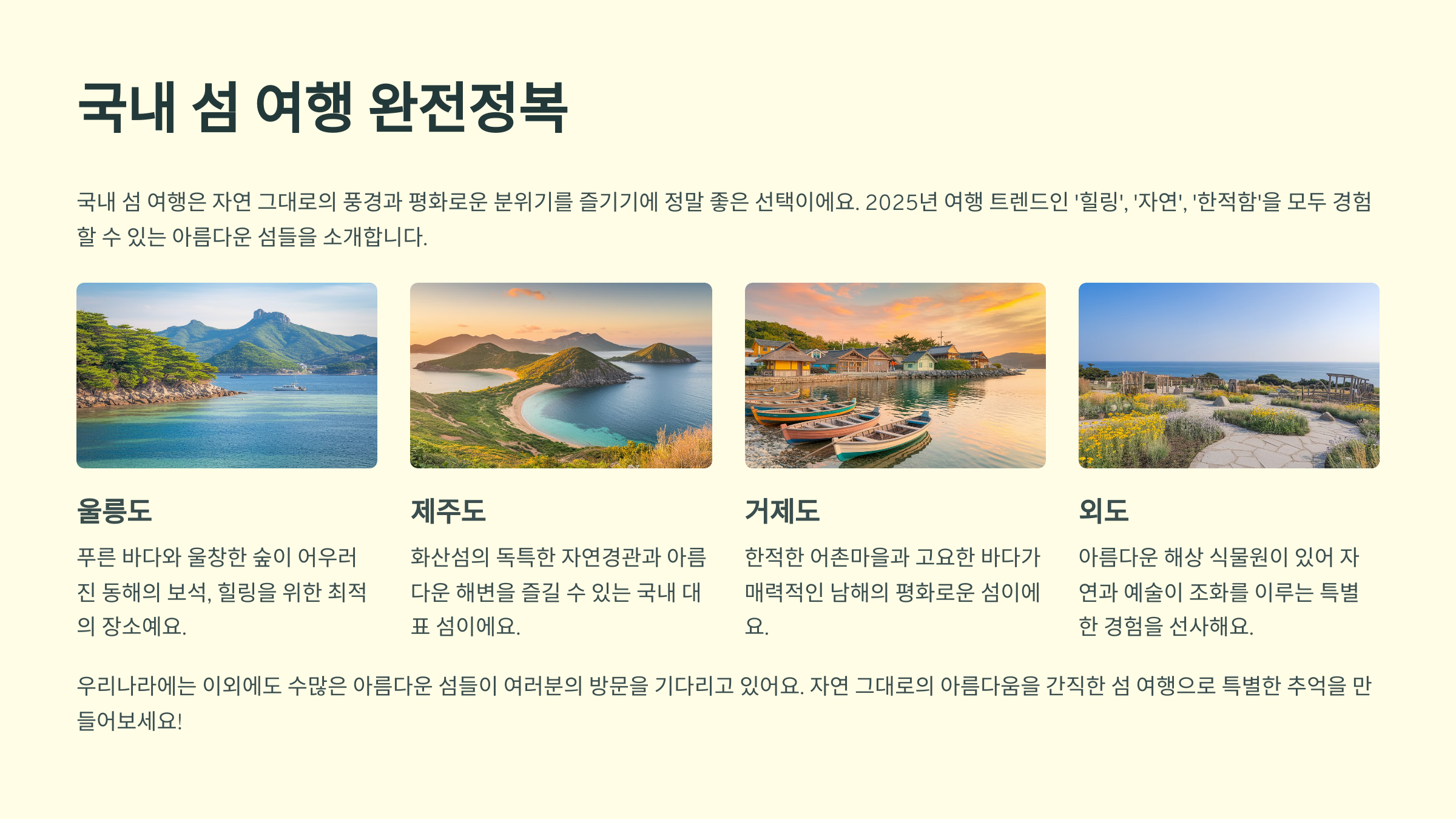 이제 국내 섬 여행을 제대로 즐길 준비가 된 거 같죠? 다음 섹션에서 본격적으로 섬 하나하나 소개해볼게요! 🌊
