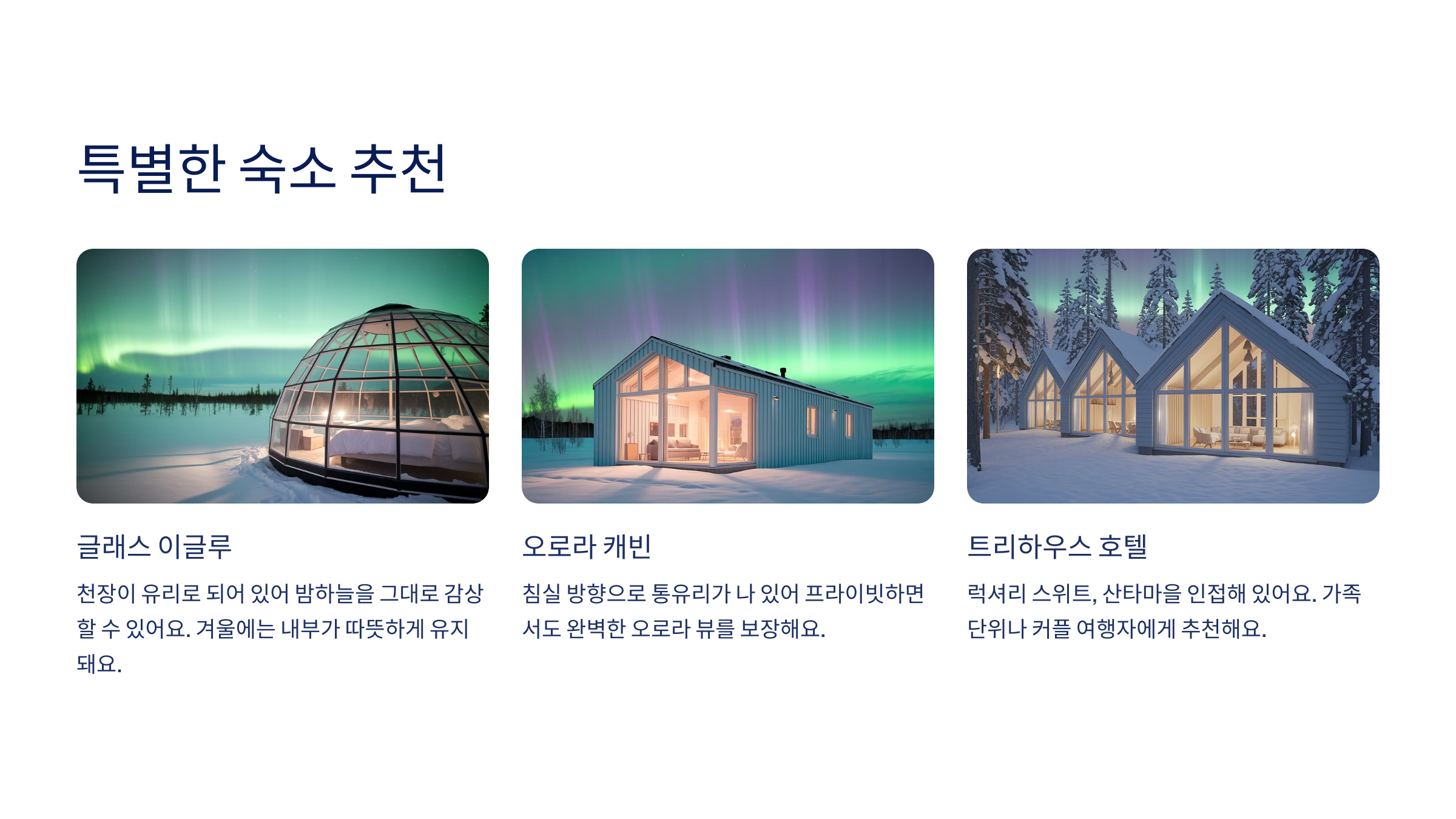 Northern Lights Village | 루오스토 | 통유리 캐빈, 오로라 알림 | ₩350,000~₩700,000 | ★★★★☆ |