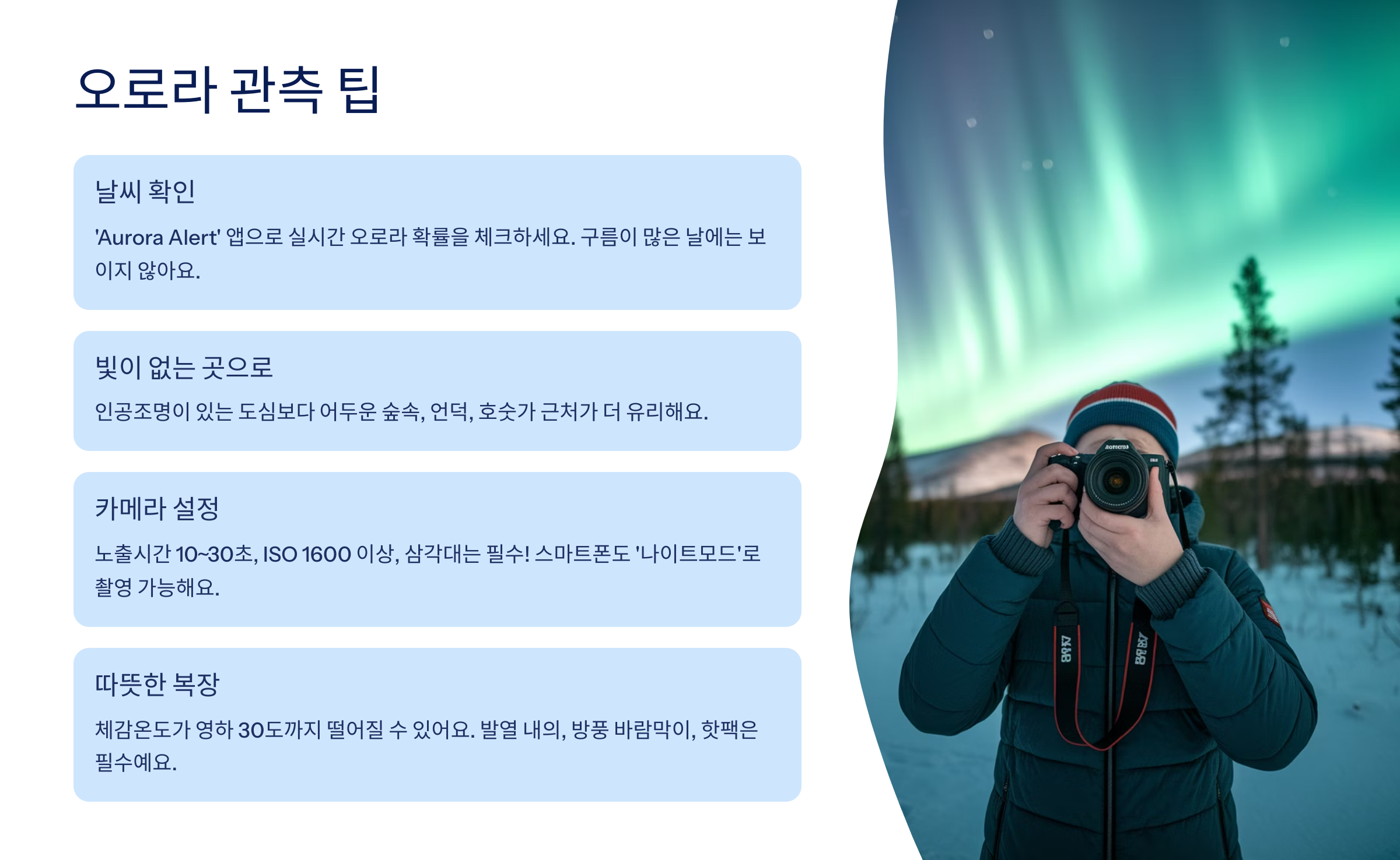이제 준비는 끝났어요! 오로라를 볼 확률도 높이고, 여행의 퀄리티도 확실히 높아질 거예요 😊