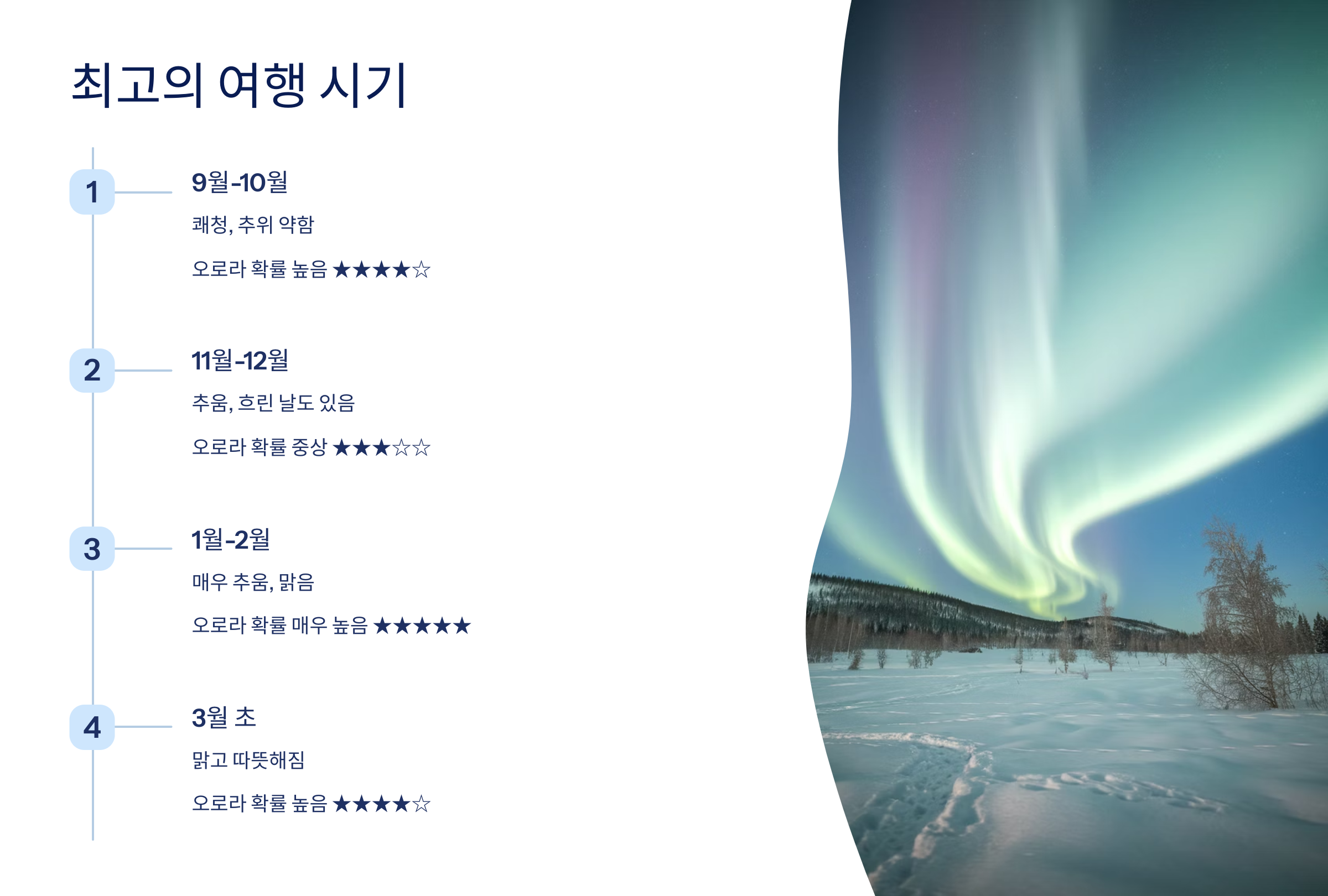 👉 다음은 ‘최고의 여행 시기 🌌’에 대해 알아볼게요! 오로라를 가장 잘 볼 수 있는 달, 시간대, 조건 등을 알려드릴게요 😊