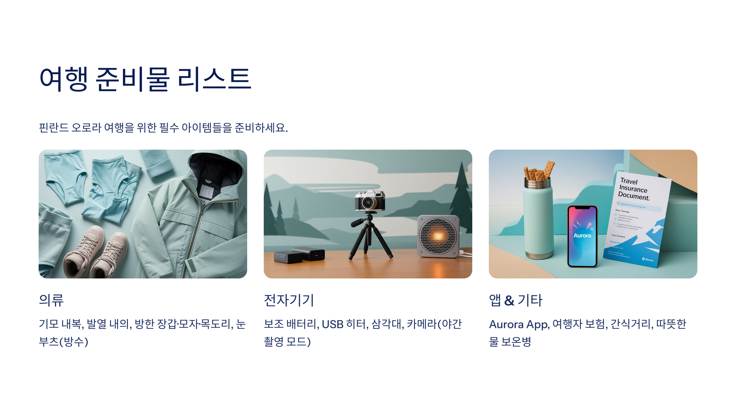 아래는 핀란드 오로라 여행 시 챙기면 좋은 물품들을 정리한 리스트예요. 체크리스트처럼 참고하면서 여행 가방을 준비해보세요! ✅
