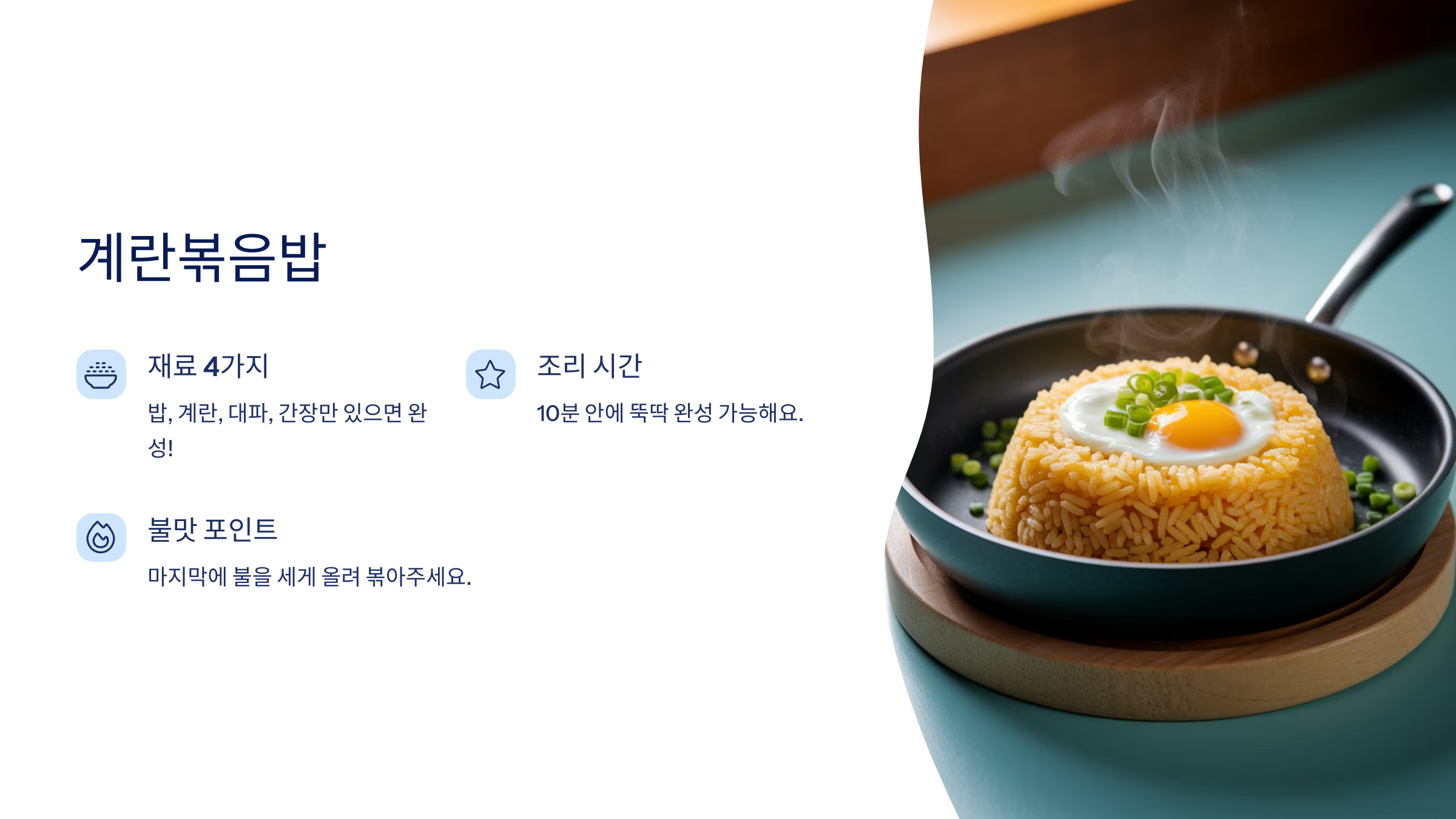 계란볶음밥은 요리 초보도 10분 안에 완성할 수 있는 대표 초간단 요리예요. 재료는 단 4가지만 있으면 돼요: 밥, 계란, 대파, 간장! 냉장고 속 아무 재료 없이도 뚝딱 만들 수 있어서 아침 대용으로도 정말 좋아요.
