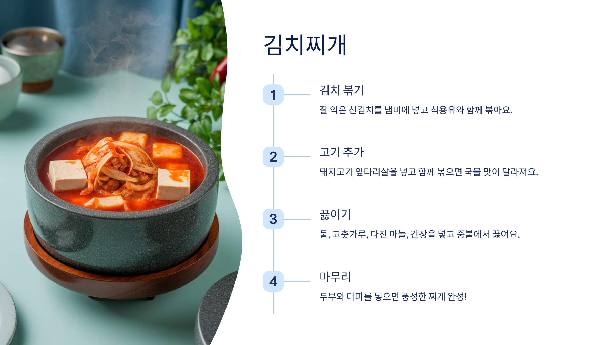 김치찌개는 밥 한 공기 뚝딱하게 만드는 마성의 집밥 메뉴죠. 속까지 시원해지는 그 맛, 안 해보면 손해예요! 🥄