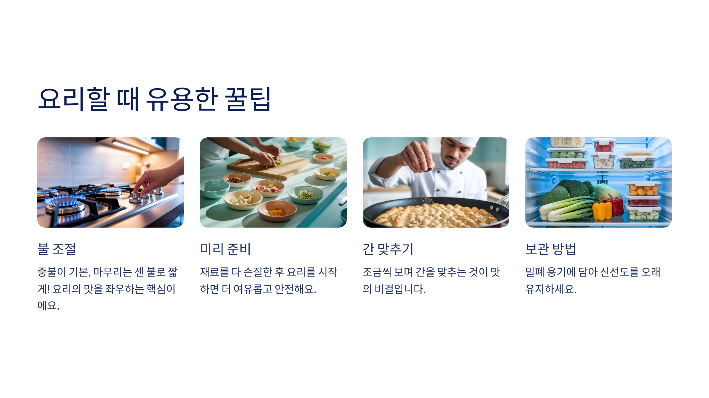 이런 팁만 기억해도 요리 실력은 눈에 띄게 향상돼요! 자신감 가지고 냄비 뚜껑 열어보세요! 😄
