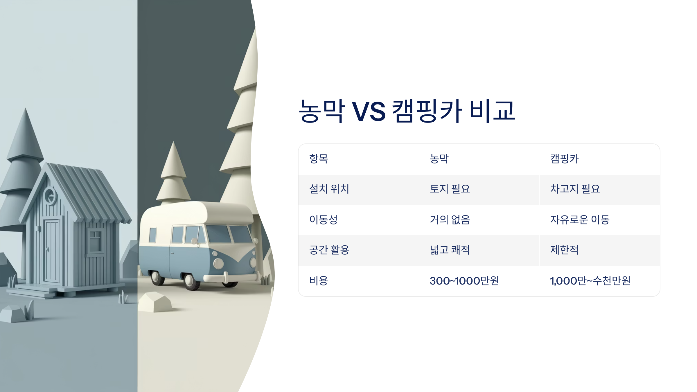 농막은 고정된 아지트, 캠핑카는 움직이는 나만의 공간. 선택은 본인의 라이프스타일에 맞춰 하면 돼요! 🚐🏕️