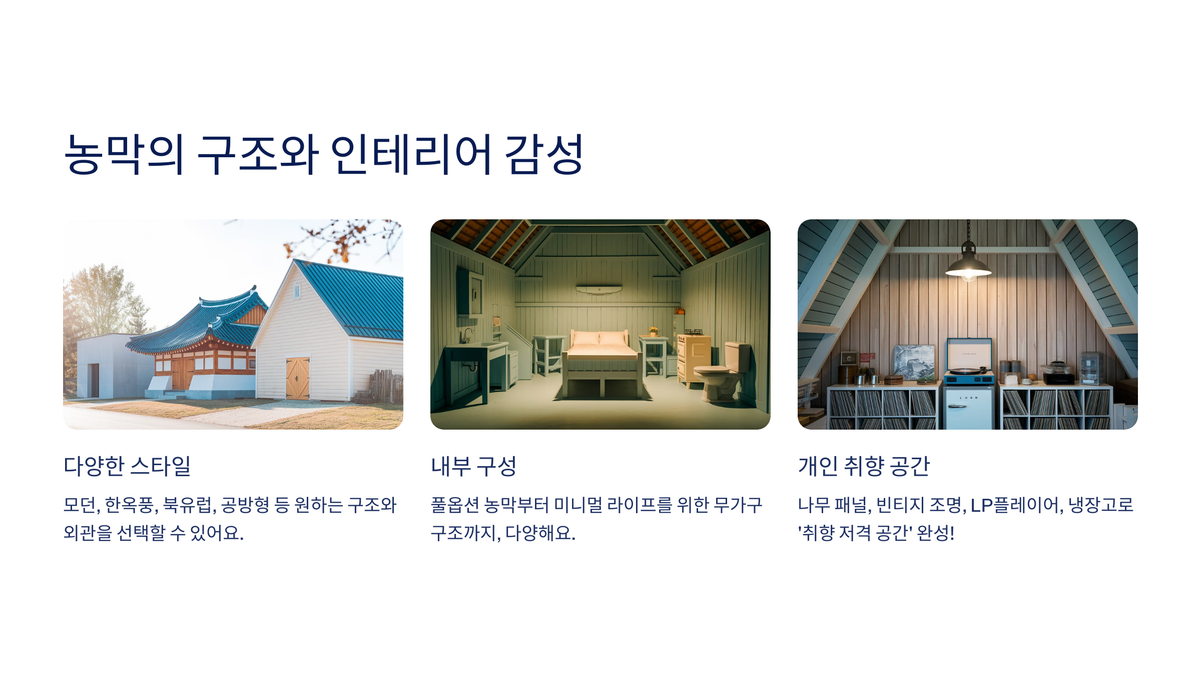 농막이라고 해서 허름한 컨테이너만 상상하면 오산이에요. 요즘은 디자인 농막 시대예요. 모던 스타일, 전통 한옥풍, 북유럽 감성, 심플한 공방형까지 다양한 구조와 외관이 있어요.