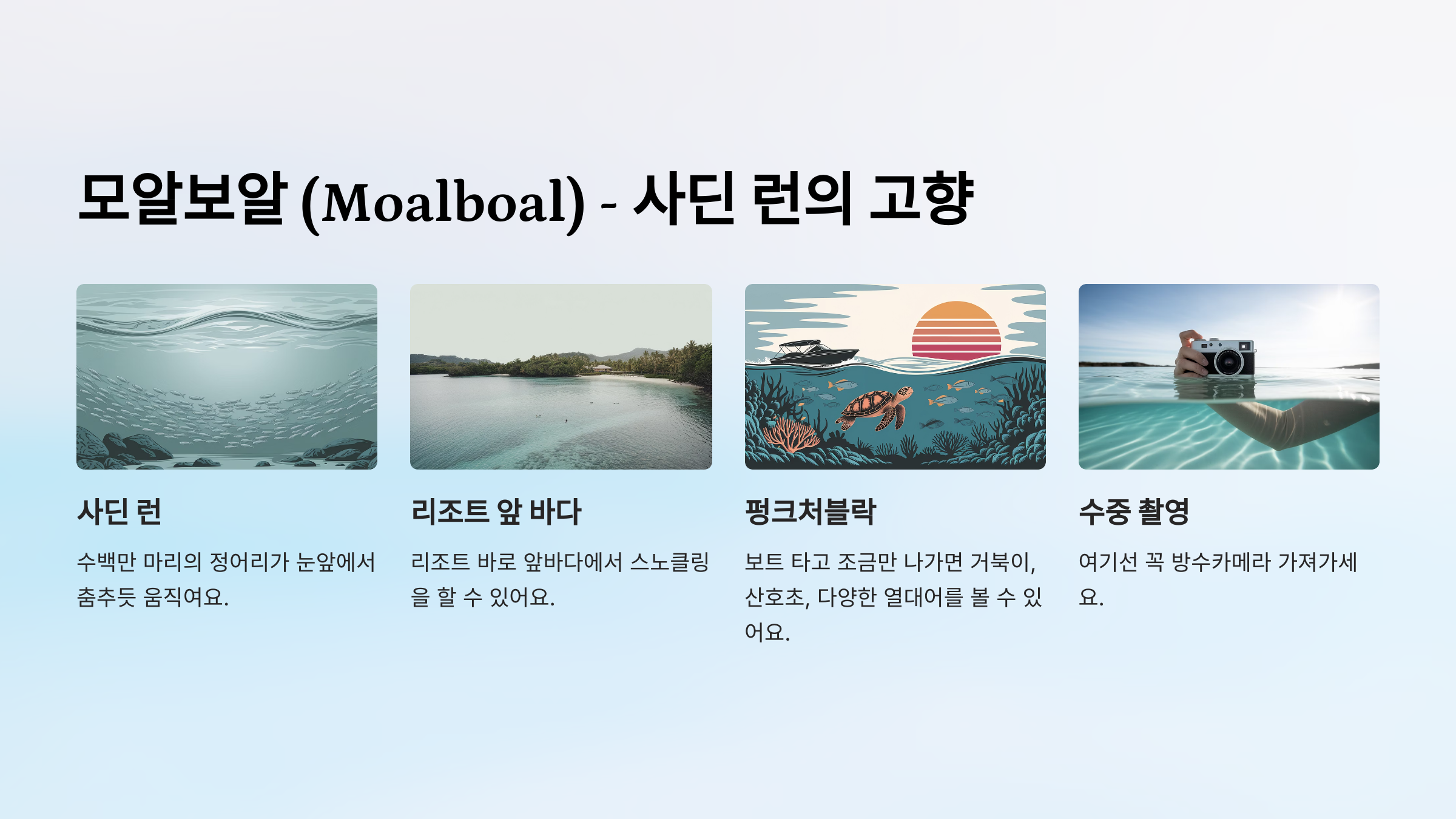 현지 어촌 마을 체험도 가능해서 **스노클링 + 로컬 문화 여행**을 함께 하고 싶은 분들에게 딱 맞는 곳이에요!