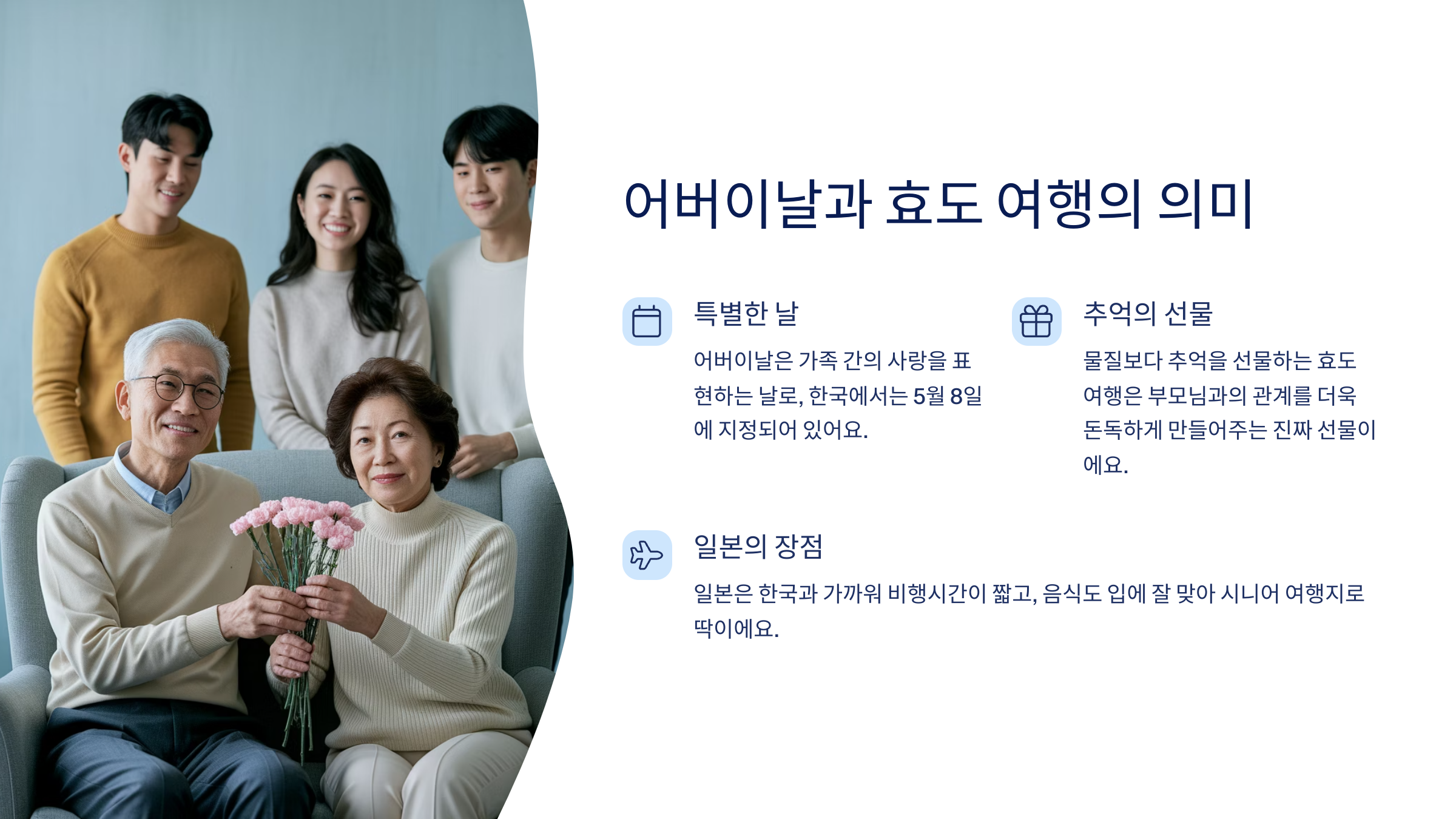 어버이날은 부모님께 감사의 마음을 전하는 특별한 날이에요. 요즘은 단순한 선물보다 함께하는 시간의 가치가 더해지고 있어서, 부모님과 함께하는 여행이 큰 인기를 끌고 있어요. 특히 일본은 가까운 거리, 편리한 교통, 다양한 관광 인프라로 효도여행지로 딱 좋답니다.🥰