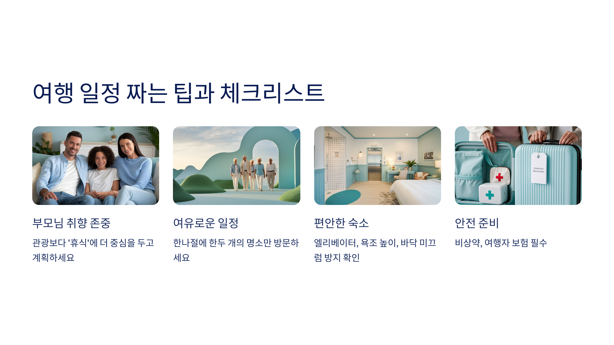 효도 여행에서 가장 중요한 건 '무리 없는 일정'과 '부모님 취향 존중'이에요. 계획을 세울 때는 관광보다 ‘휴식’에 더 중심을 두고, 체력과 건강 상태를 고려해서 동선을 잡아야 진짜 성공적인 여행이 된답니다. 출국 전에 미리 숙소와 교통편은 확정하는 것이 좋아요.
